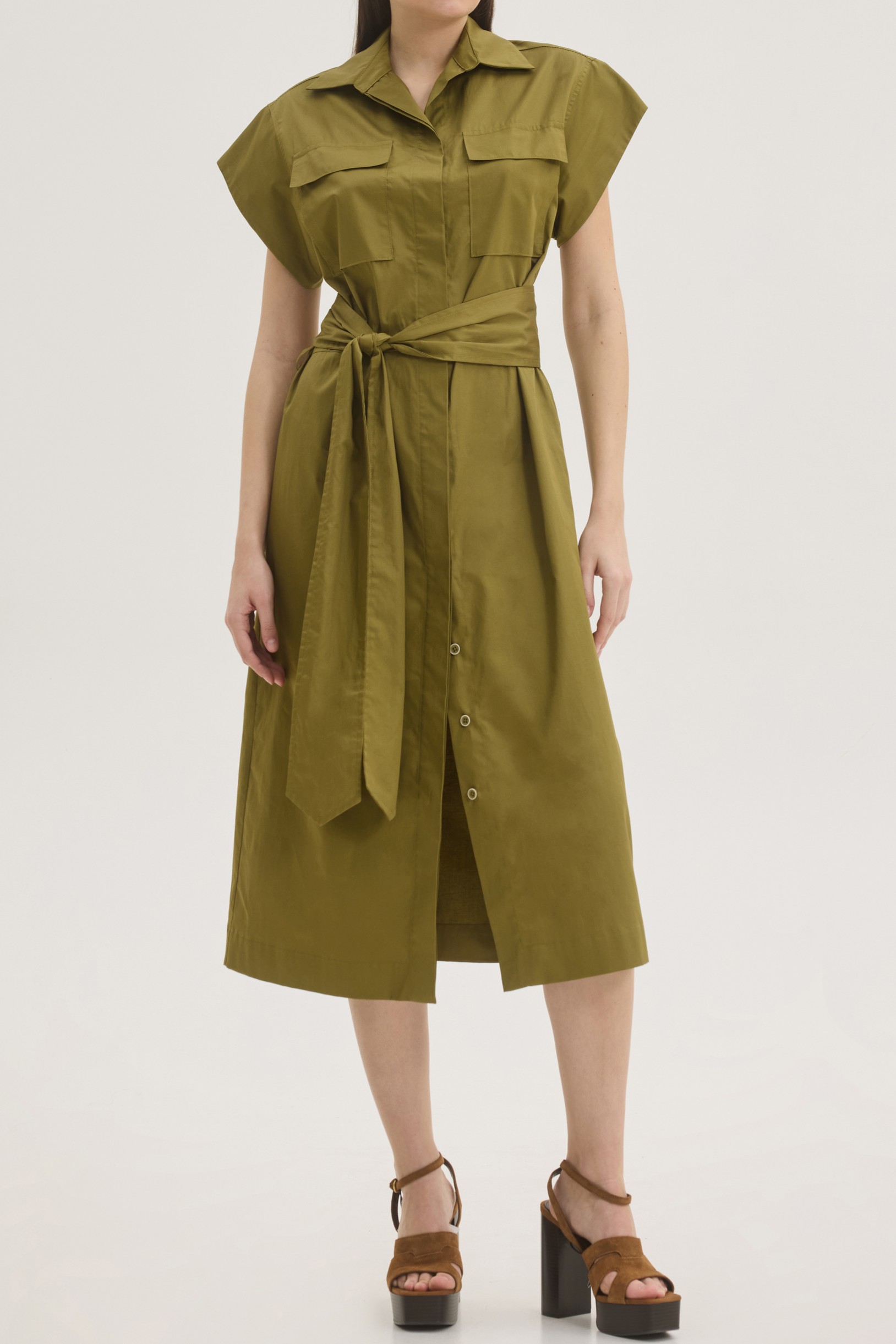 Safari φόρεμα που συνδυάζει κομψότητα και πρακτικότητα με μοντέρνο, utility χαρακτήρα. Η αποσπώμενη ζώνη από το ίδιο ύφασμα τονίζει τη μέση και διαμορφώνει θηλυκή σιλουέτα, ενώ η άνετη γραμμή και το ελαφρύ ύφασμα το καθιστούν ιδανικό για all day εμφανίσεις. Το μήκος κάτω από το γόνατο προσφέρει κομψό και διαχρονικό αποτέλεσμα. Φόρεσέ το με πέδιλα ή πλατφόρμες για chic καλοκαιρινό look ή συνδύασέ το με sneakers για πιο casual διάθεση. Ένα versatile κομμάτι που δεν πρέπει να λείπει από τη συλλογή σου.