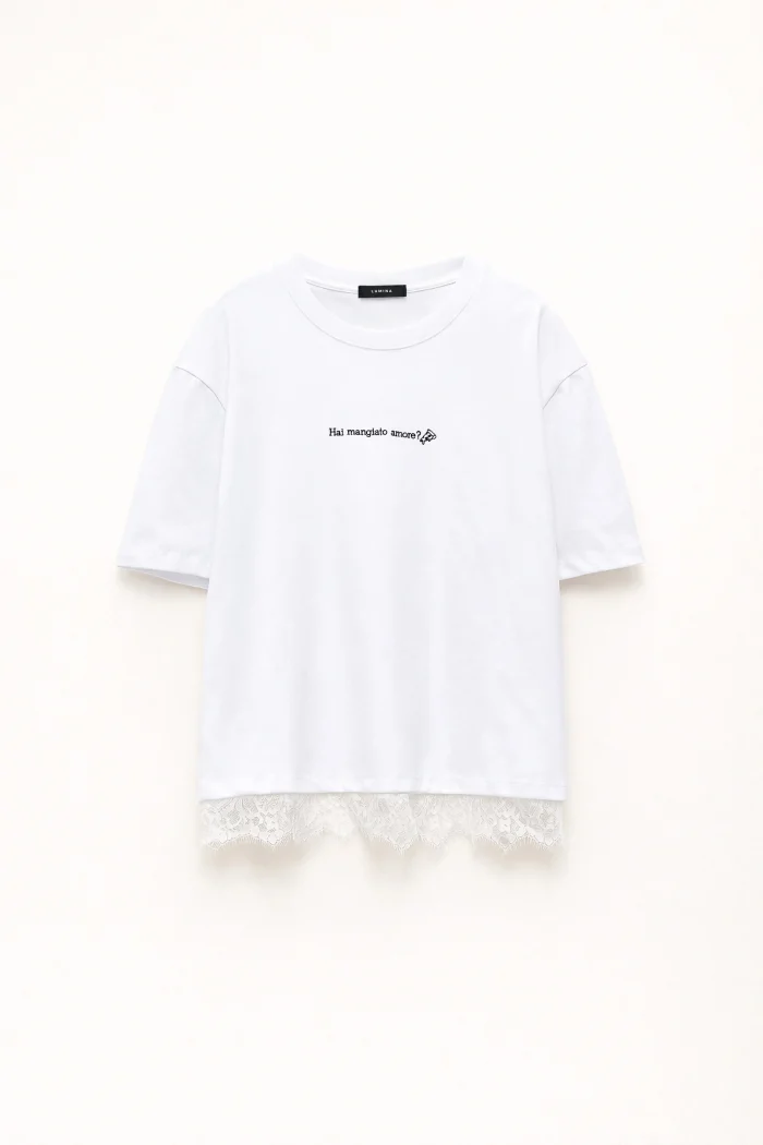 Ένα T-shirt που επαναπροσδιορίζει το everyday basic μέσα από μικρές αλλά ουσιαστικές λεπτομέρειες. Η χαλαρή γραμμή του προσφέρει άνεση και ανεπιτήδευτη κομψότητα, ενώ το διακριτικό μήνυμα στο μπροστινό μέρος προσθέτει μια playful και ανεπιτήδευτα ρομαντική διάθεση. Η δαντελένια λεπτομέρεια στο τελείωμα δημιουργεί ένα ενδιαφέρον layering effect, φέρνοντας μια πιο φίνα και θηλυκή αισθητική σε ένα κατά τα άλλα minimal κομμάτι. Ιδανικό για σύγχρονα looks που ισορροπούν ανάμεσα στο casual και το refined.