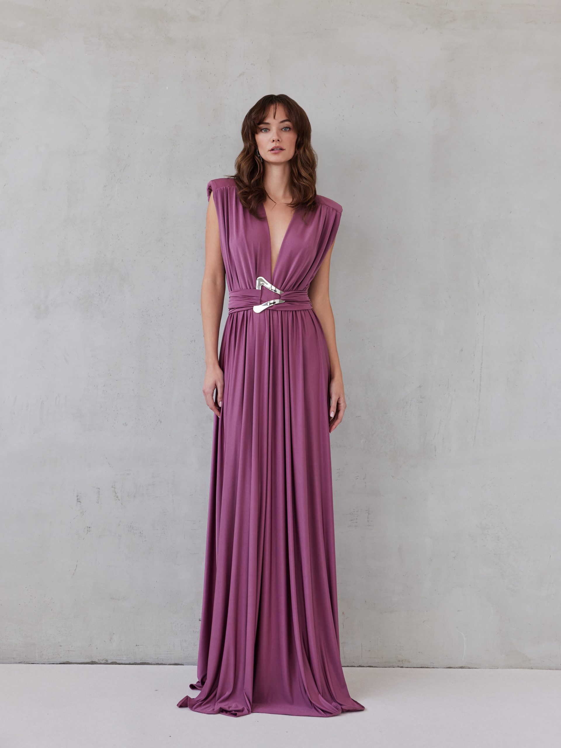 Ένα φόρεμα που συνδυάζει αέρινη κομψότητα με σύγχρονη αισθητική. Η ρευστή γραμμή του πέφτει απαλά στο σώμα, δημιουργώντας μια φίνα και επιμήκη σιλουέτα που κινείται με χάρη. Το βαθύ V ντεκολτέ αναδεικνύει το πάνω μέρος του σώματος με διακριτική θηλυκότητα, ενώ οι δομημένοι ώμοι προσθέτουν μια μοντέρνα και δυναμική πινελιά στο σχέδιο. Η μέση τονίζεται μέσα από τη ζώνη που αγκαλιάζει το σώμα και ολοκληρώνεται με μια ιδιαίτερη μεταλλική λεπτομέρεια, προσφέροντας χαρακτήρα και κομψότητα. Η μακριά, αέρινη φούστα ολοκληρώνει το σύνολο με κίνηση και ελαφρότητα, ενώ η λεπτομέρεια της ζώνης στο πίσω μέρος δίνει μια εκλεπτυσμένη τελική πινελιά. Ένα φόρεμα που ισορροπεί ιδανικά ανάμεσα στη διαχρονική φινέτσα και τη σύγχρονη κομψότητα.