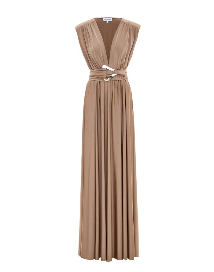 Ένα φόρεμα που συνδυάζει αέρινη κομψότητα με σύγχρονη αισθητική. Η ρευστή γραμμή του πέφτει απαλά στο σώμα, δημιουργώντας μια φίνα και επιμήκη σιλουέτα που κινείται με χάρη. Το βαθύ V ντεκολτέ αναδεικνύει το πάνω μέρος του σώματος με διακριτική θηλυκότητα, ενώ οι δομημένοι ώμοι προσθέτουν μια μοντέρνα και δυναμική πινελιά στο σχέδιο. Η μέση τονίζεται μέσα από τη ζώνη που αγκαλιάζει το σώμα και ολοκληρώνεται με μια ιδιαίτερη μεταλλική λεπτομέρεια, προσφέροντας χαρακτήρα και κομψότητα. Η μακριά, αέρινη φούστα ολοκληρώνει το σύνολο με κίνηση και ελαφρότητα, ενώ η λεπτομέρεια της ζώνης στο πίσω μέρος δίνει μια εκλεπτυσμένη τελική πινελιά. Ένα φόρεμα που ισορροπεί ιδανικά ανάμεσα στη διαχρονική φινέτσα και τη σύγχρονη κομψότητα.