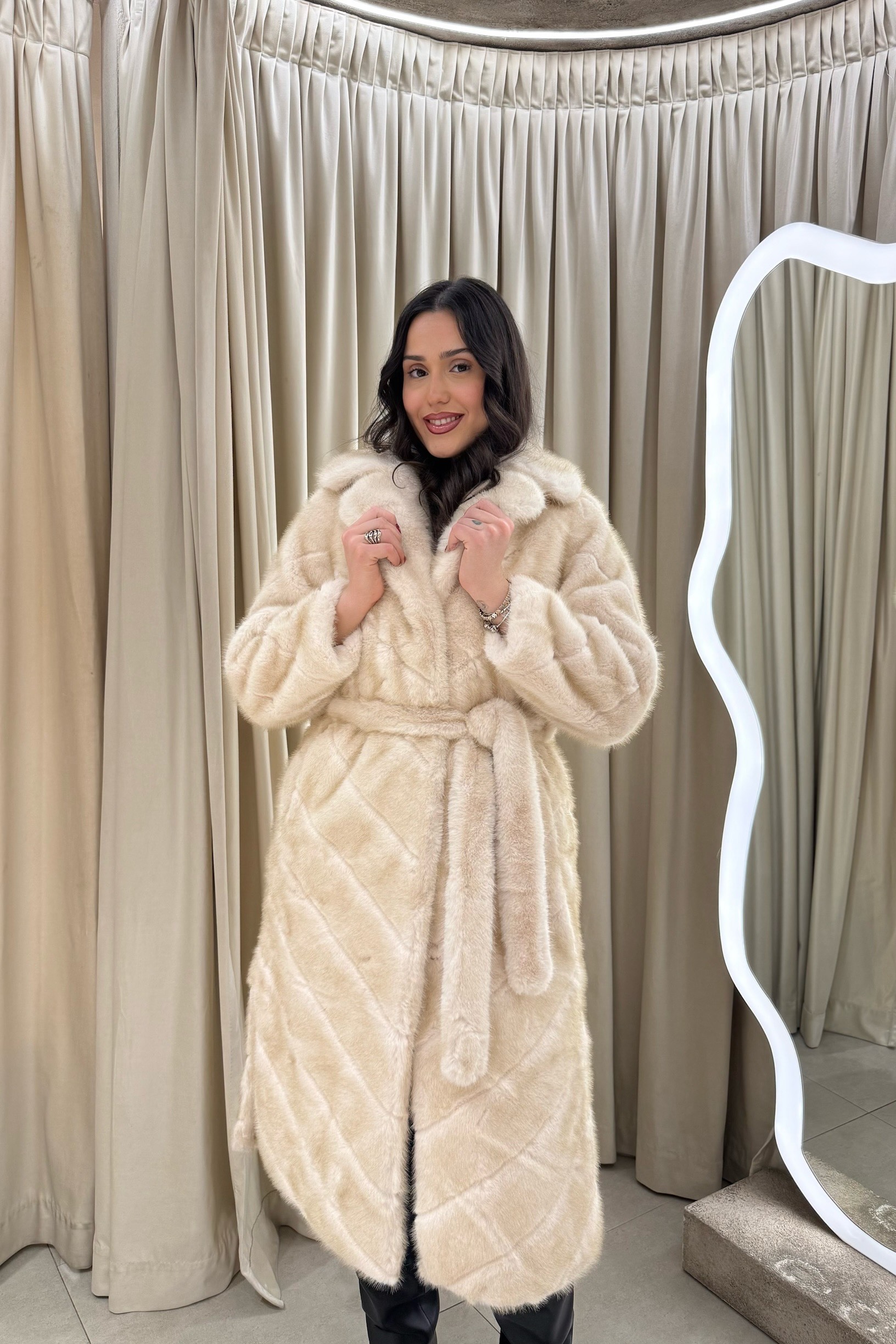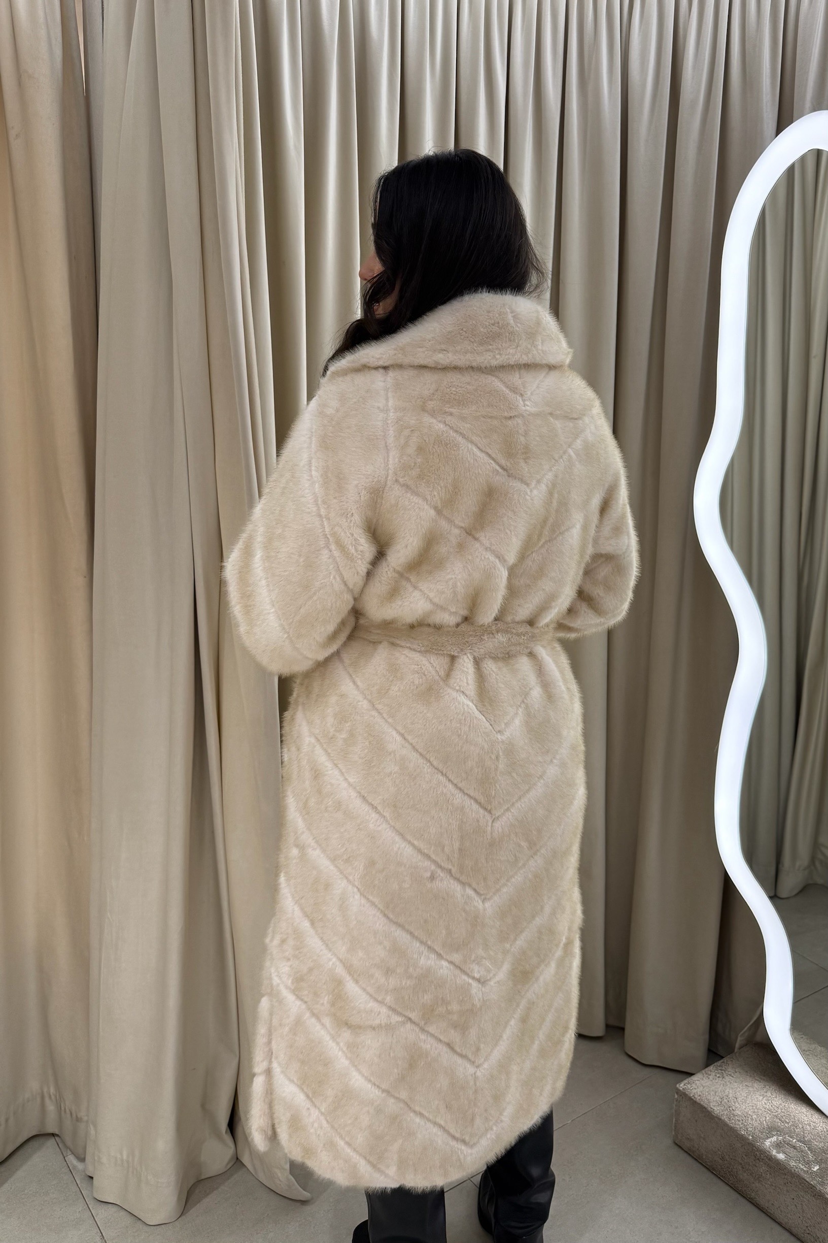 Μια μακριά εντυπωσιακή γούνα με γεωμετρική ραφή και ζώνη που δομεί τη σιλουέτα. Η έντονη παρουσία του μετατρέπει κάθε εμφάνιση σε editorial στιγμή, ισορροπώντας ανάμεσα στη statement αισθητική και τη διαχρονική φινέτσα.