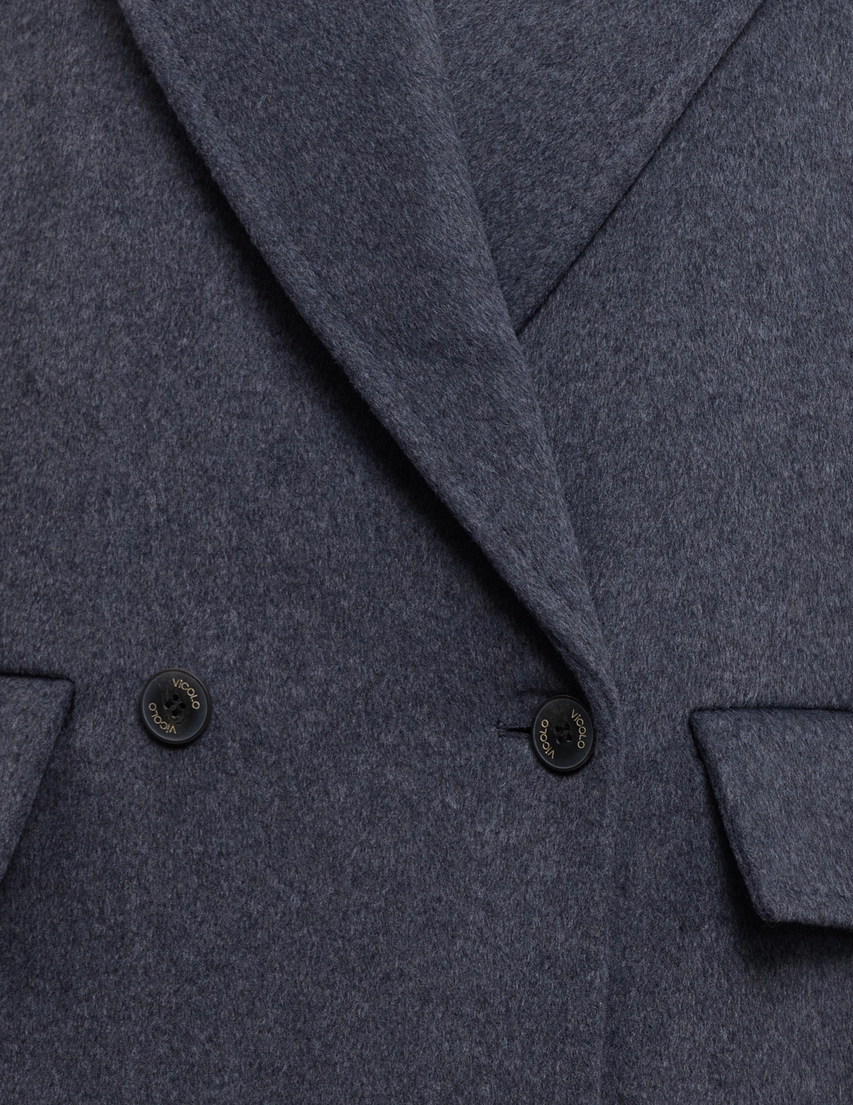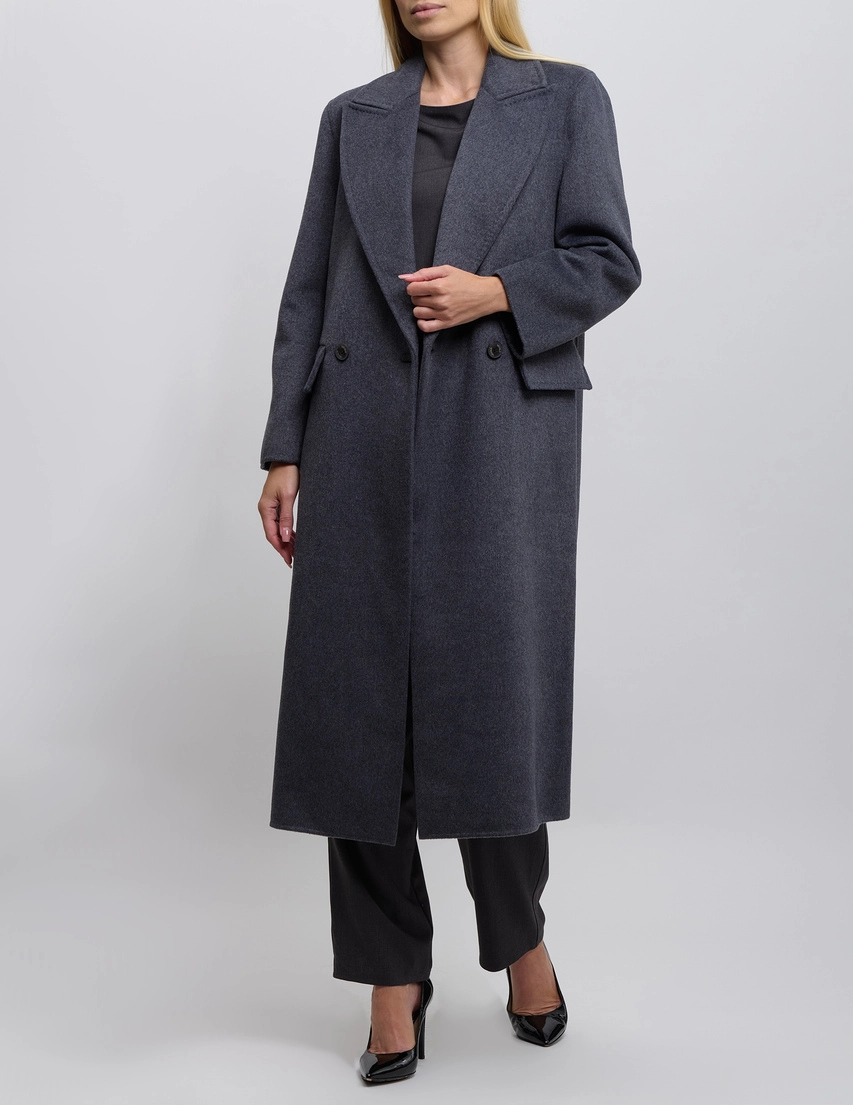 - Μακρύ παλτό από μαλλί με πέτο γιακά και μακριά μανίκια.