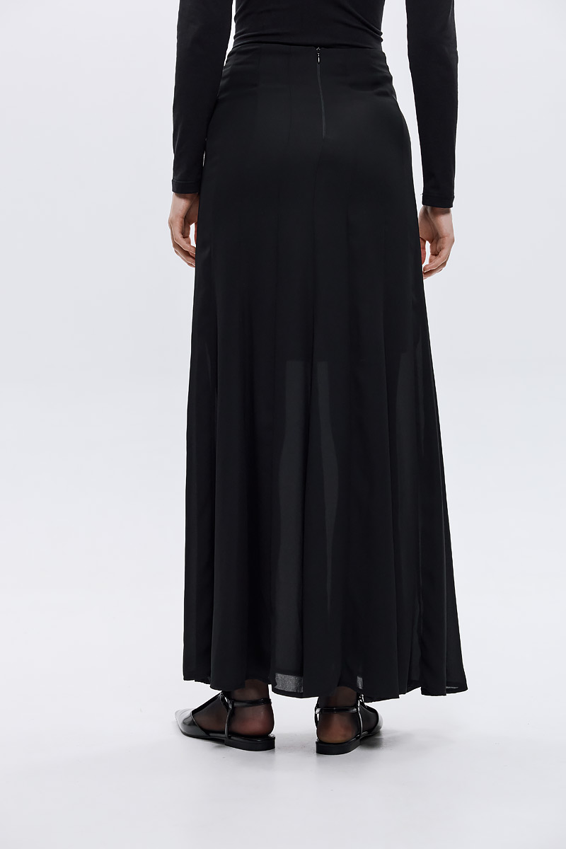 Η Cambell φούστα ενσαρκώνει την απόλυτη αρμονία ανάμεσα στη ρευστότητα και τη δύναμη. Με ανάλαφρη, ημιδιάφανη υφή που ακολουθεί κάθε κίνηση και minimal γραμμή που αγκαλιάζει τη μέση, προσφέρει έναν αέρα διακριτικής θηλυκότητας.Το μήκος maxi και η κομψή της κίνηση την καθιστούν ιδανική τόσο για καθημερινά monochrome looks όσο και για πιο βραδινές εμφανίσεις. Συνδύασέ τη με το μαύρο cropped ζακετάκι για ένα effortlessly elegant total black σύνολο που αποπνέει σιγουριά και μοντέρνο δυναμισμό.