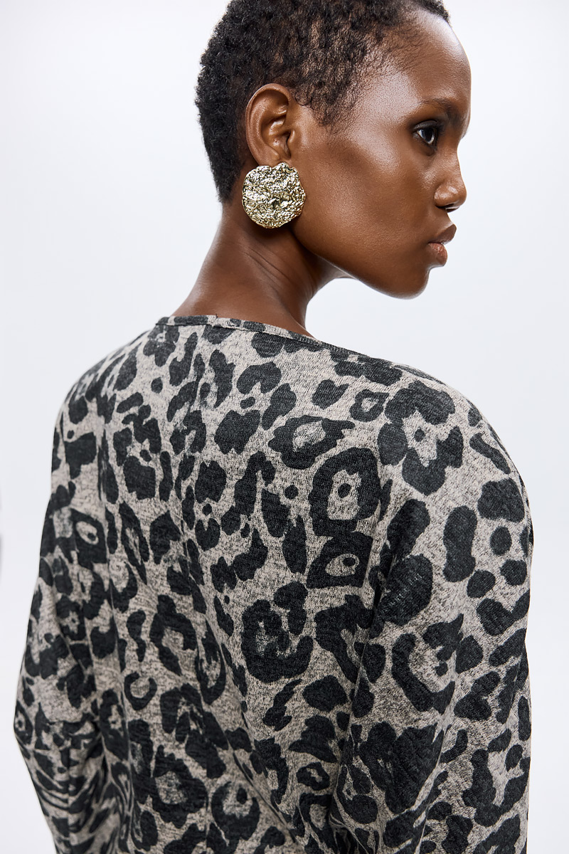 Ένα φόρεμα που αποπνέει δυναμισμό και αυτοπεποίθηση. Το animal print σε γκρι και μαύρες αποχρώσεις το καθιστά ένα κομμάτι–δήλωση, ιδανικό για εντυπωσιακές εμφανίσεις. Η μίνι γραμμή του και η χαλαρή εφαρμογή στα μανίκια ισορροπούν ανάμεσα στη θηλυκότητα και τη μοντέρνα αισθητική, προσφέροντας στυλ που σίγουρα δεν περνά απαρατήρητο.