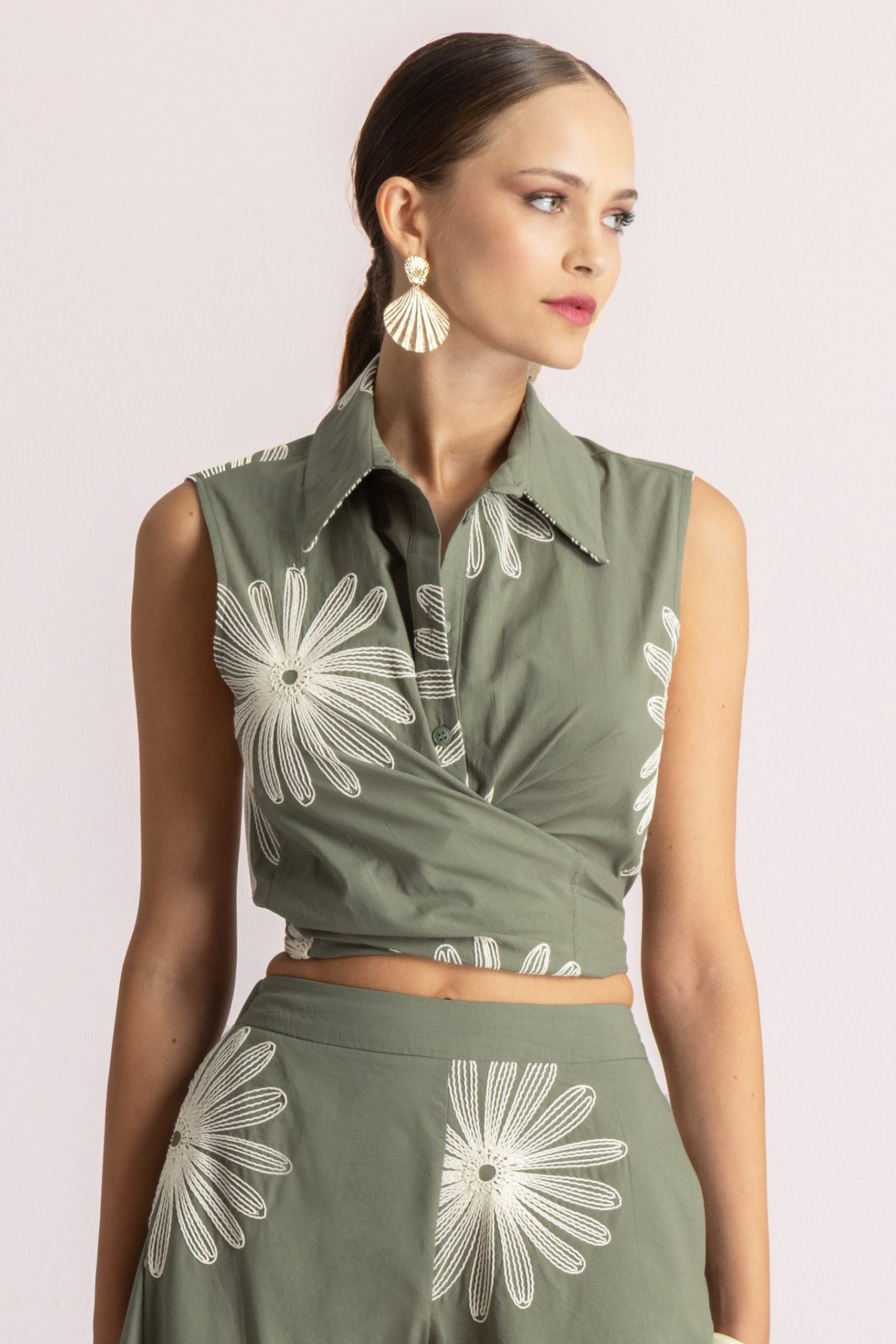 Ένα κομψό wrap top που αγκαλιάζει τη σιλουέτα και δημιουργεί μια θηλυκή και σύγχρονη γραμμή. Ο σχεδιασμός του προσθέτει κίνηση και κομψότητα, ενώ η διακριτική του δομή αναδεικνύει το σώμα με φυσικό τρόπο. Ένα κομμάτι που ισορροπεί ανάμεσα στη θηλυκότητα και τη μοντέρνα αισθητική, ιδανικό τόσο για ιδιαίτερες εμφανίσεις όσο και για πιο καθημερινές στιγμές. Συνδυάζεται ιδανικά με το αντίστοιχο παντελόνι για ένα ολοκληρωμένο και εντυπωσιακό σετ.