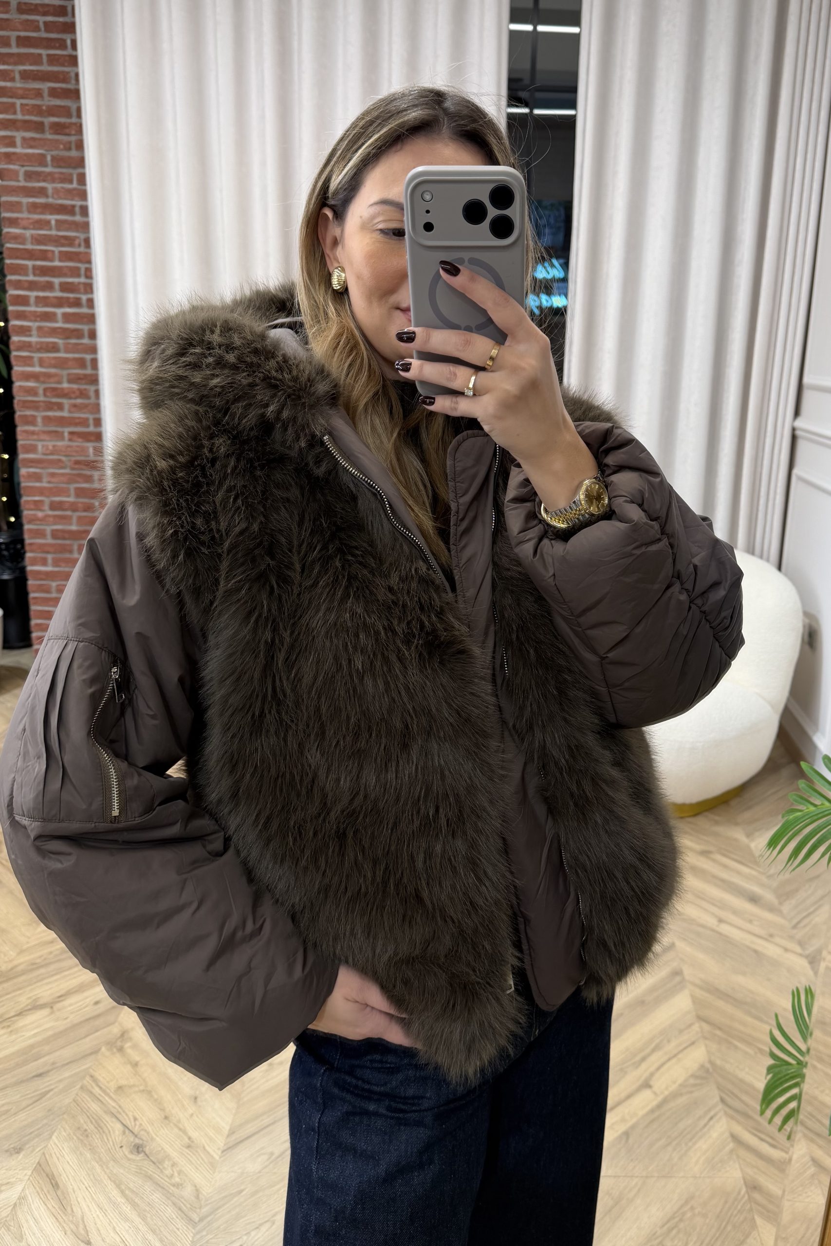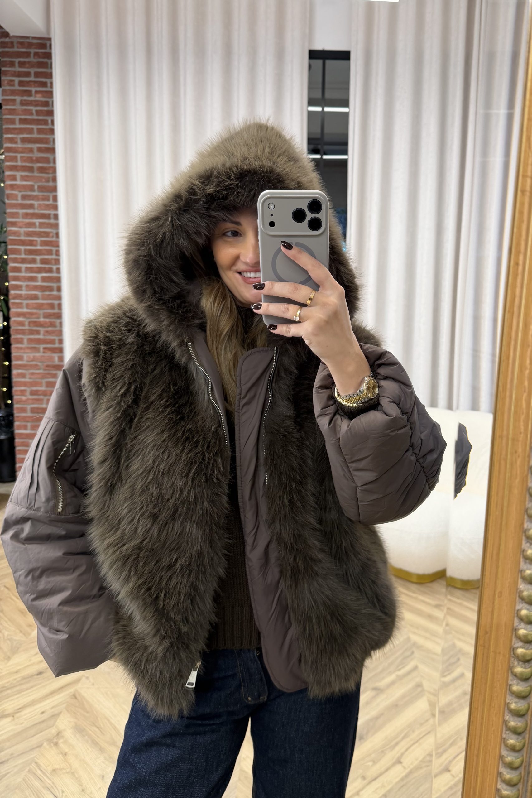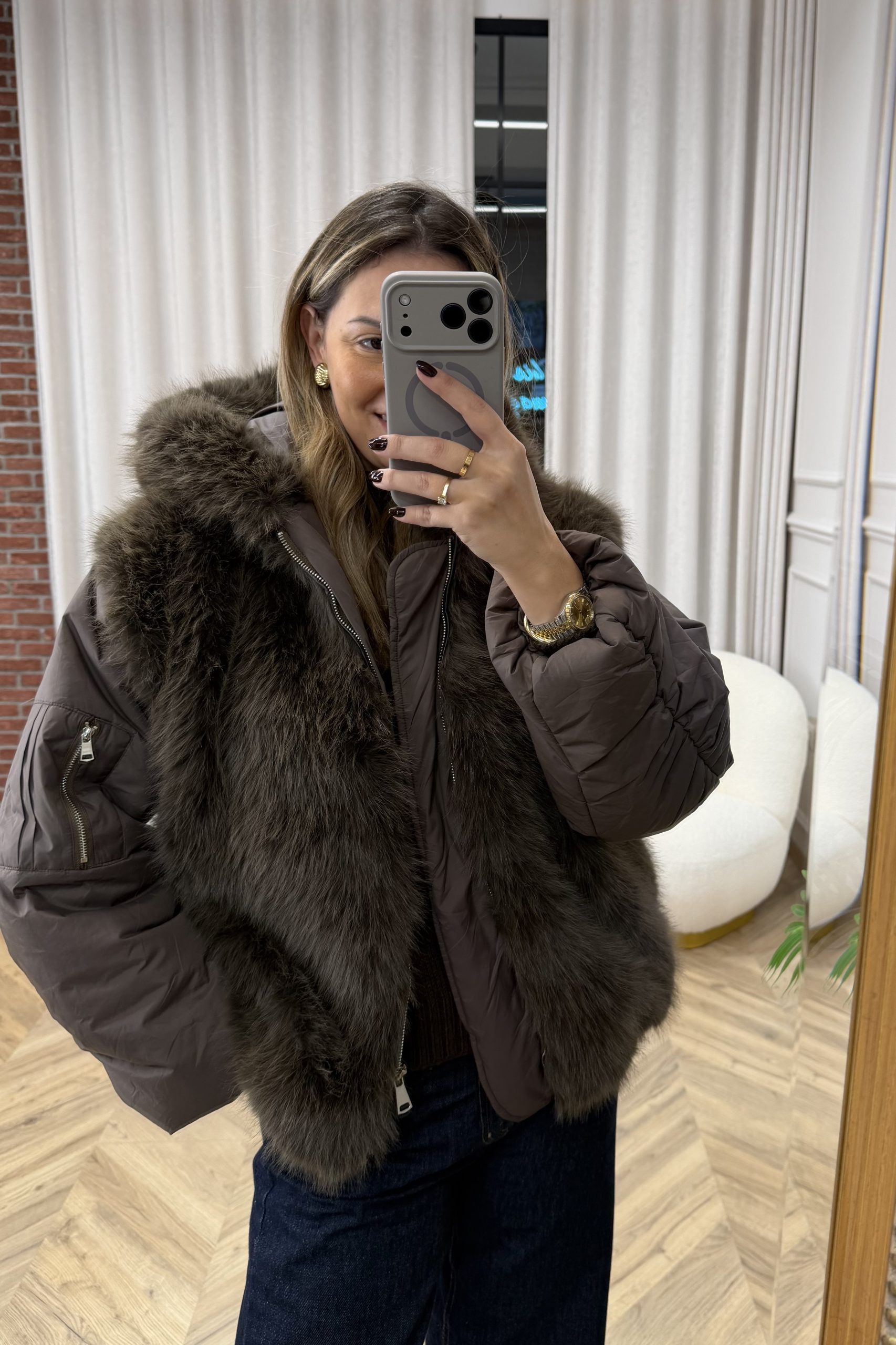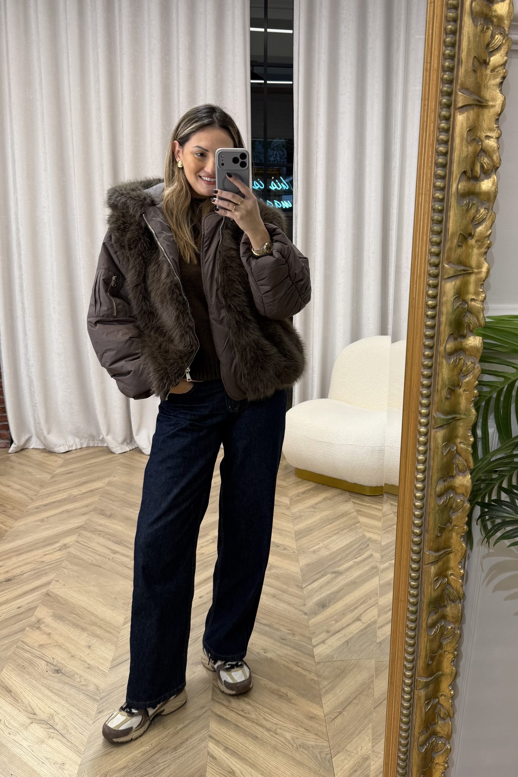 Urban αισθητική και πολυτελής πινελιά συνδυάζονται σε ένα statement κομμάτι. Το καφέ bomber jacket με γούνα στο μπροστινό μέρος επαναπροσδιορίζει τη χειμερινή street chic εικόνα. Ένα δυναμικό look που αποπνέει αυτοπεποίθηση και στιλ, τέλειο για τις πιο ψυχρές ημέρες της πόλης.