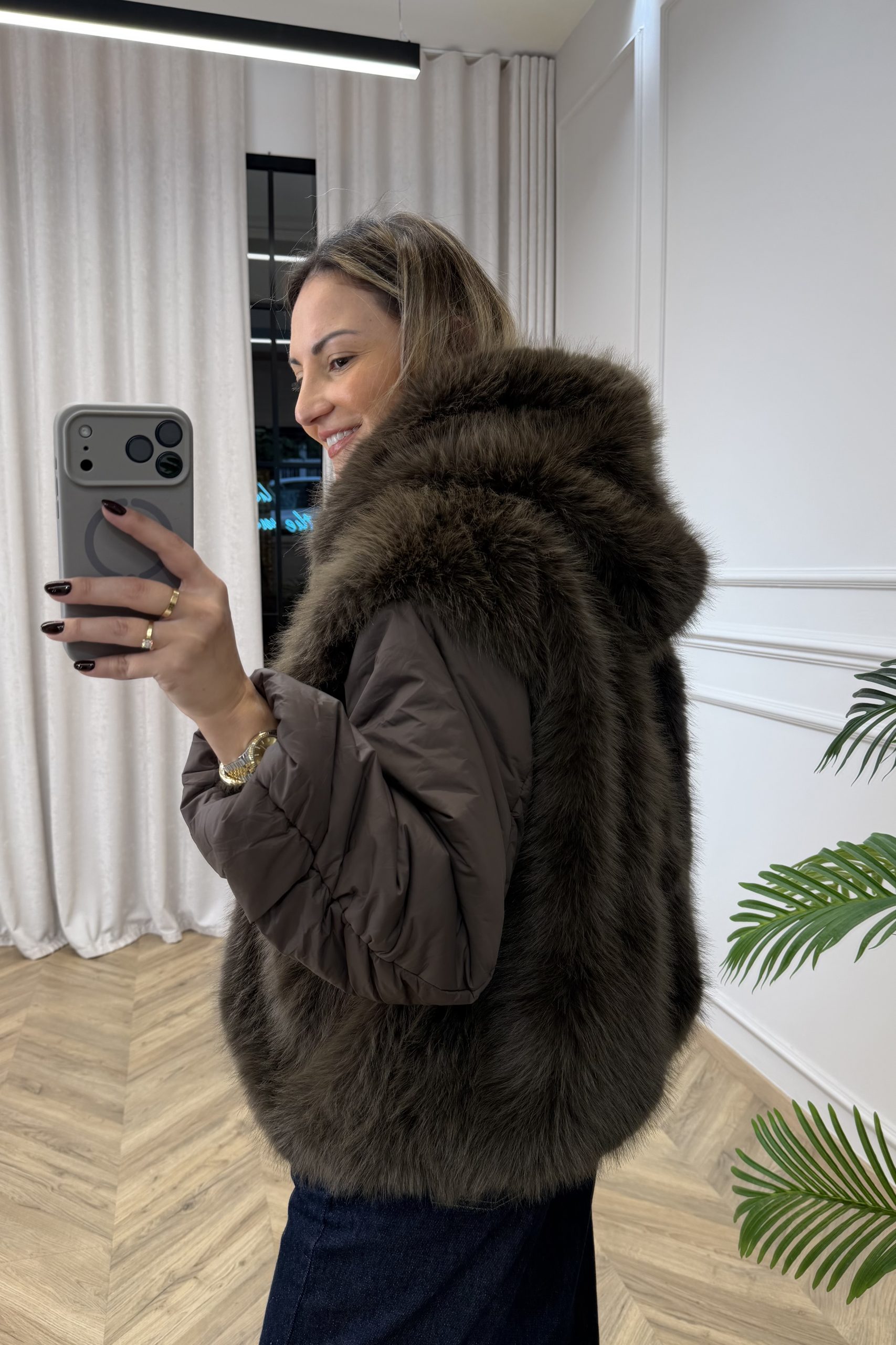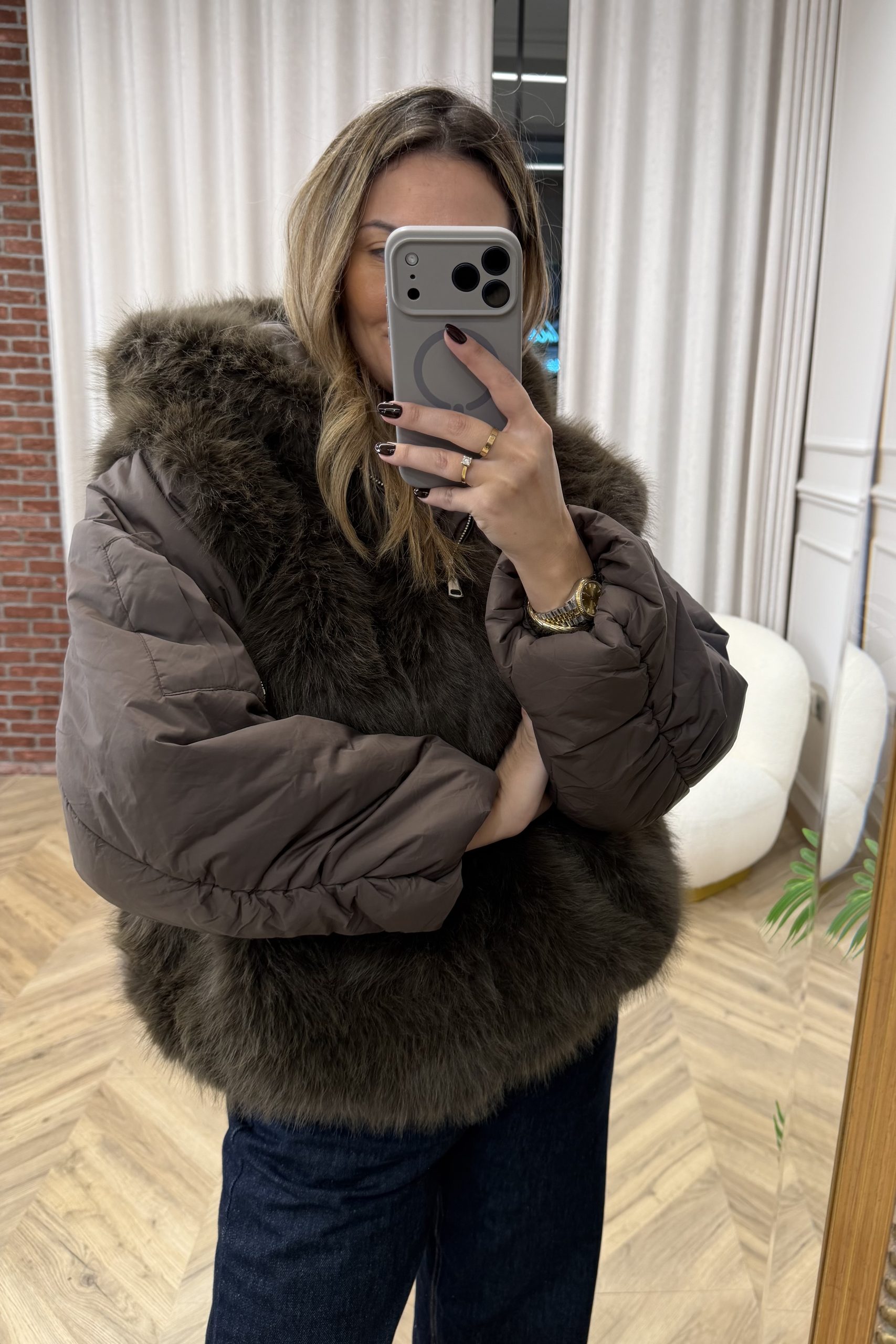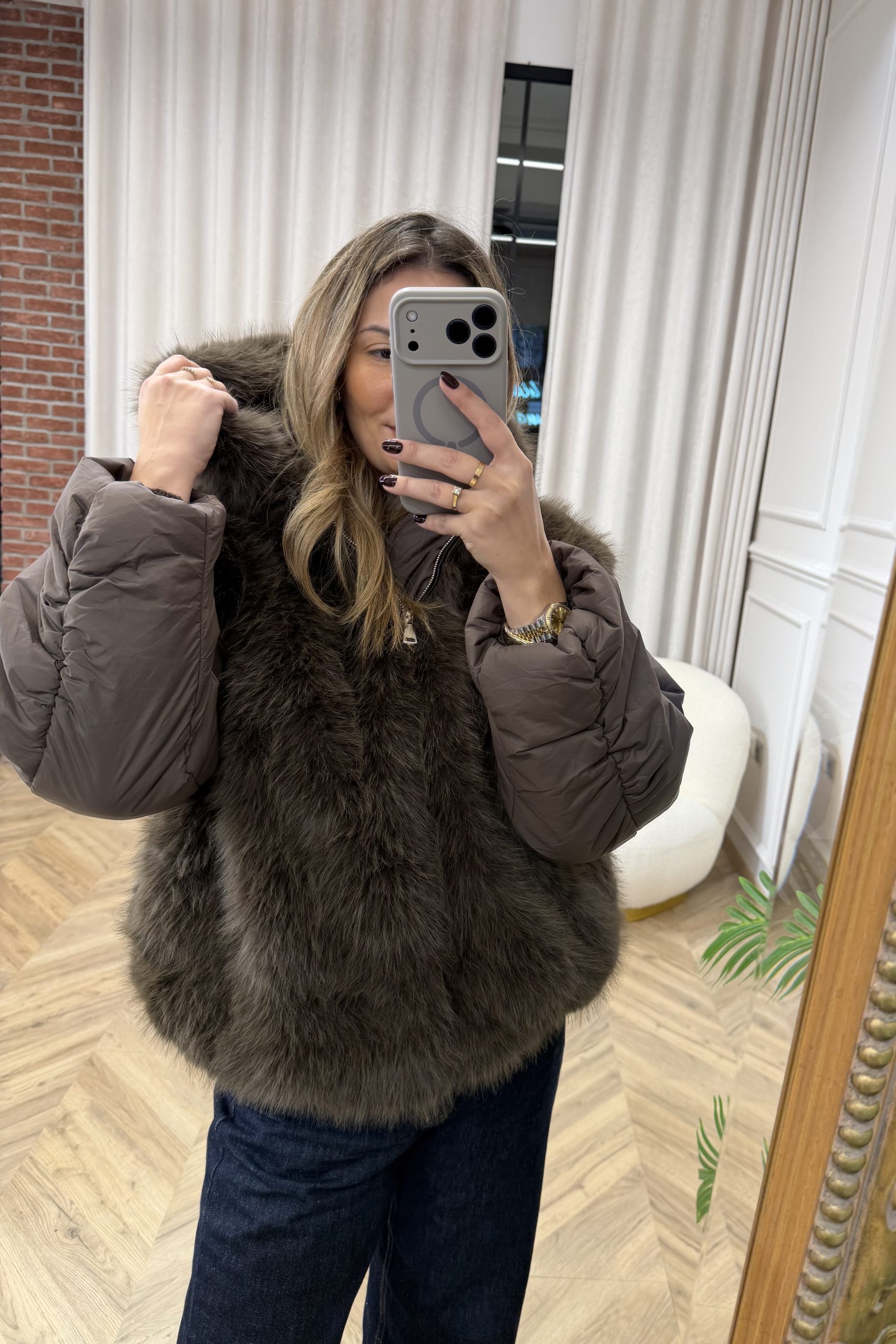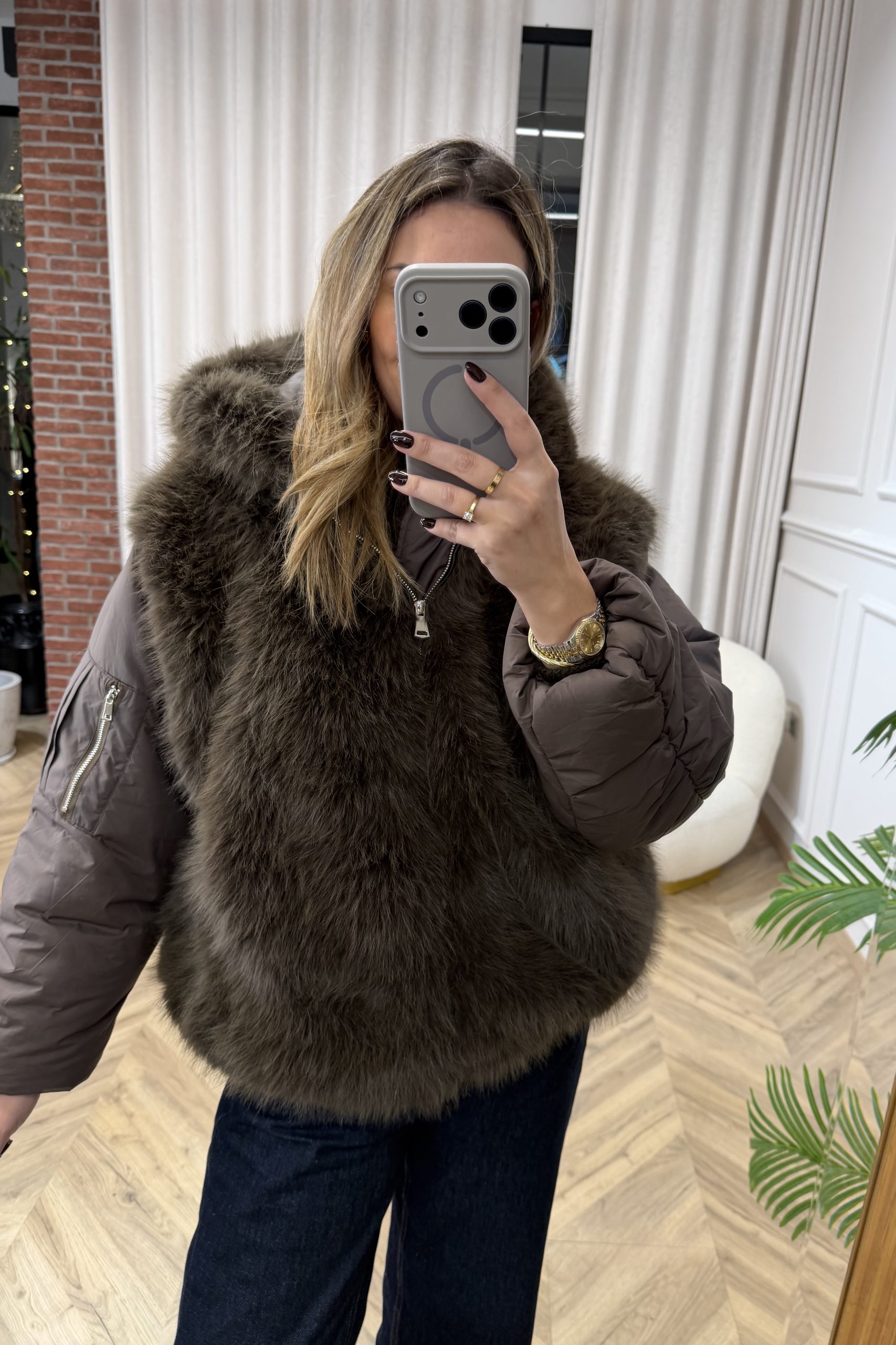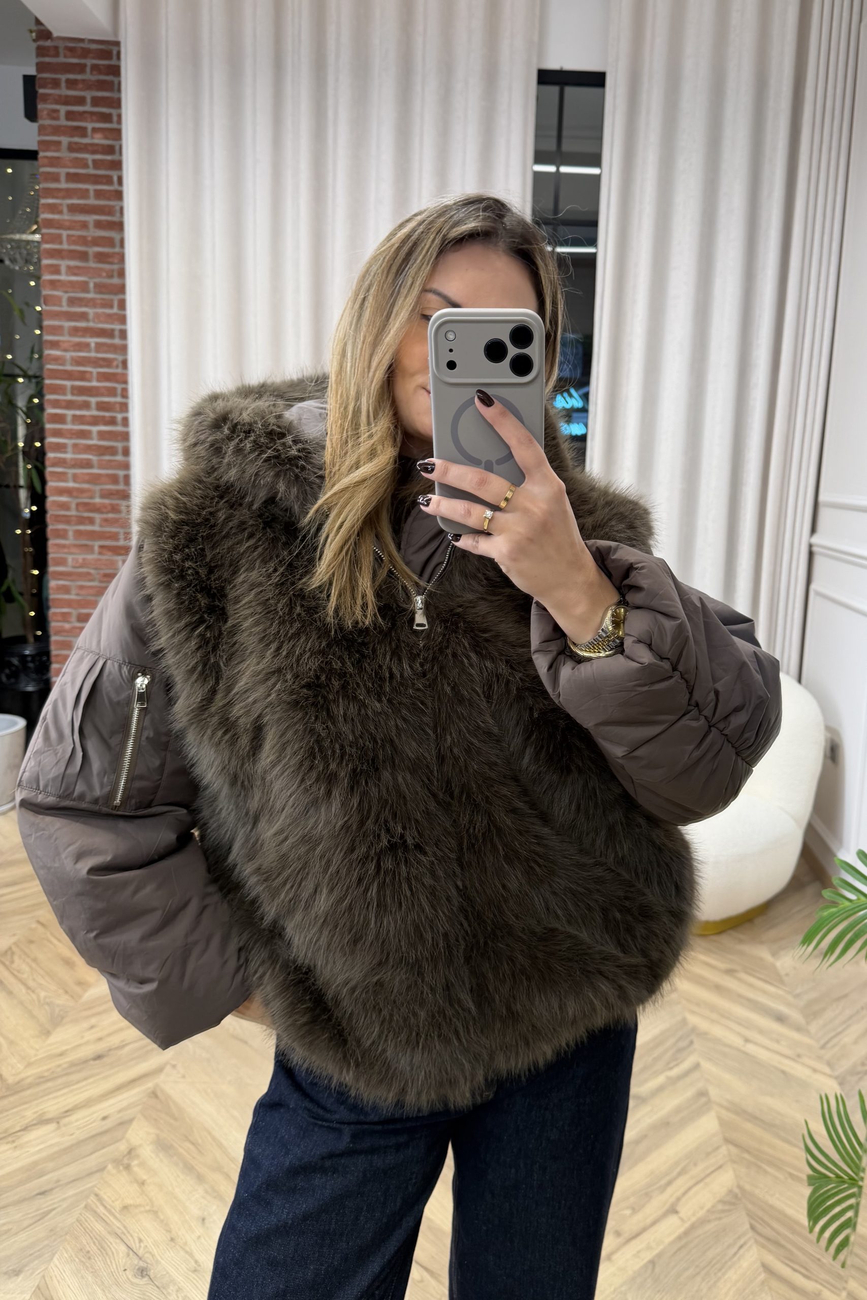 Urban αισθητική και πολυτελής πινελιά συνδυάζονται σε ένα statement κομμάτι. Το καφέ bomber jacket με γούνα στο μπροστινό μέρος επαναπροσδιορίζει τη χειμερινή street chic εικόνα. Ένα δυναμικό look που αποπνέει αυτοπεποίθηση και στιλ, τέλειο για τις πιο ψυχρές ημέρες της πόλης.