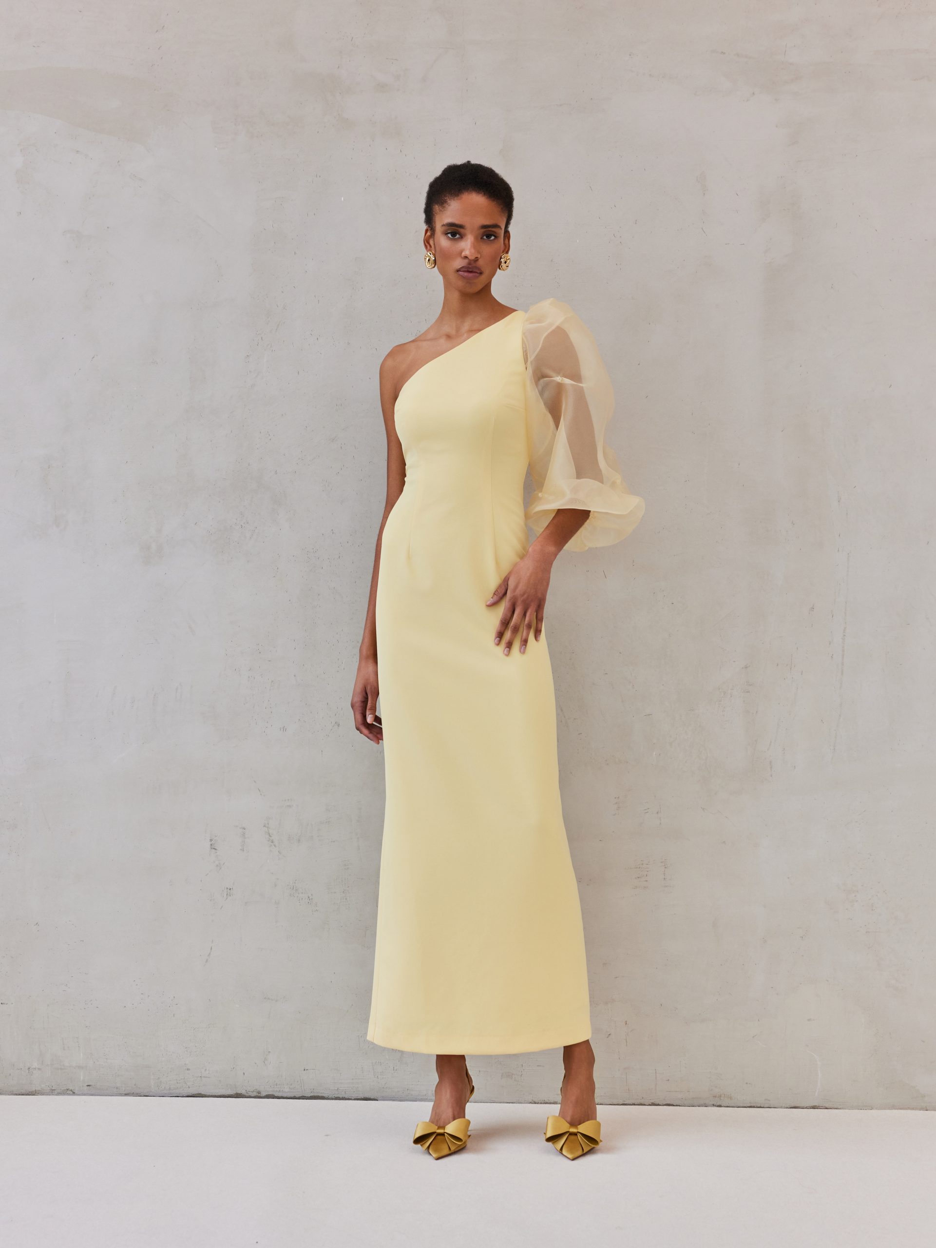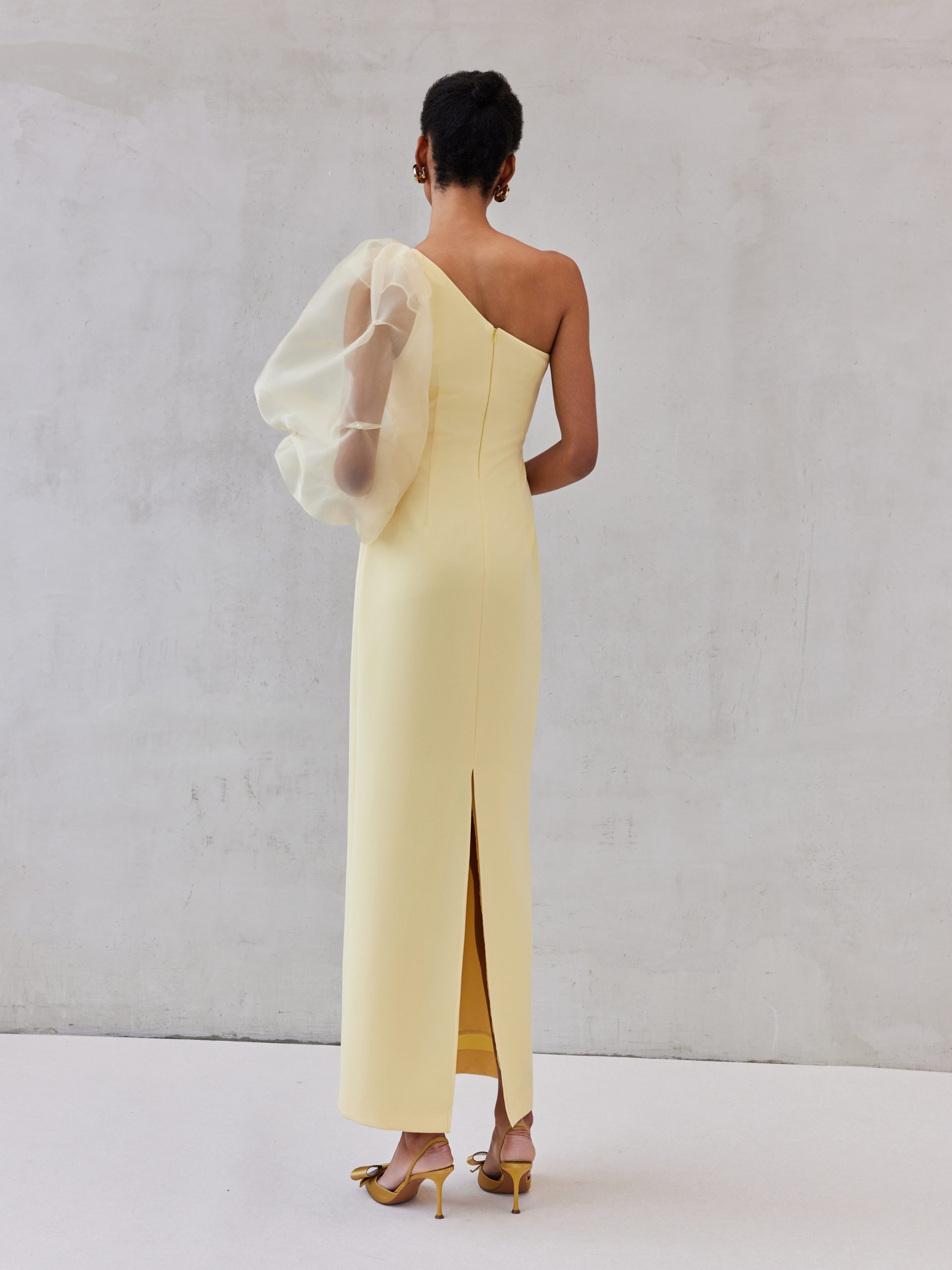 Ένα εντυπωσιακό φόρεμα που συνδυάζει σύγχρονη κομψότητα με ιδιαίτερο σχεδιασμό. Η one-shoulder γραμμή αναδεικνύει διακριτικά τη σιλουέτα, ενώ το εντυπωσιακό μανίκι από διάφανο ύφασμα προσθέτει όγκο και κίνηση, δημιουργώντας μια δυναμική αλλά εκλεπτυσμένη αισθητική. Η εφαρμοστή γραμμή αγκαλιάζει το σώμα και καταλήγει σε μια κομψή μάξι φόρμα, ενώ το διακριτικό άνοιγμα στο πίσω μέρος προσφέρει άνεση και θηλυκότητα στην κίνηση. Ένα statement κομμάτι που ξεχωρίζει για τον σύγχρονο χαρακτήρα και την elegant απλότητά του, ιδανικό για ιδιαίτερες περιστάσεις.