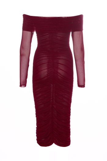 Αιθέρια κομψότητα και διαχρονική θηλυκότητα — αυτό το off-shoulder φόρεμα σε βαθύ μπορντό χρώμα είναι η απόλυτη πρόταση για τις πιο glamorous εμφανίσεις της σεζόν.