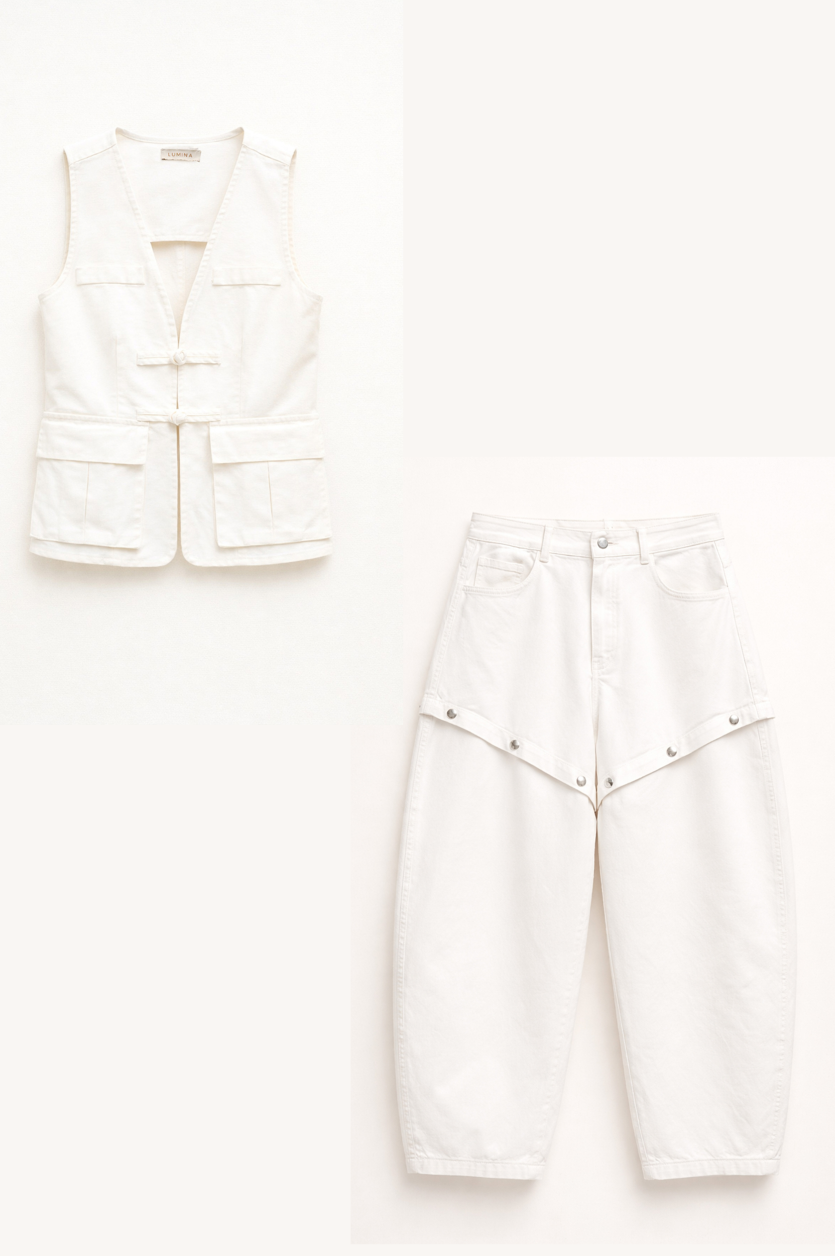 Ένα σύγχρονο σετ που ισορροπεί ιδανικά ανάμεσα σε utility αισθητική και εκλεπτυσμένο design, δημιουργώντας ένα δυναμικό αλλά απόλυτα φορέσιμο αποτέλεσμα. Το γιλέκο, με τη δομημένη γραμμή και το βαθύ άνοιγμα μπροστά, αναδεικνύει τη σιλουέτα με διακριτική θηλυκότητα, ενώ οι λειτουργικές τσέπες και οι προσεγμένες ραφές προσθέτουν χαρακτήρα και μία ανεπιτήδευτη πρακτικότητα. Το sleeveless κόψιμο ενισχύει τη σύγχρονη ταυτότητα του κομματιού, καθιστώντας το ιδανικό τόσο για layering όσο και για πιο καθαρές, minimal εμφανίσεις. Το παντελόνι ακολουθεί μία χαλαρή, ελαφρώς sculpted γραμμή που προσφέρει άνεση και ταυτόχρονα διαμορφώνει μία μοντέρνα σιλουέτα. Οι σχεδιαστικές λεπτομέρειες στο επάνω μέρος δημιουργούν ενδιαφέρον όγκο και αρχιτεκτονική δομή, δίνοντας στο κομμάτι μία fashion-forward διάσταση χωρίς να χάνει την ευελιξία του. Φορεμένα μαζί, συνθέτουν ένα ολοκληρωμένο look με έντονη προσωπικότητα, ιδανικό για γυναίκες που επιλέγουν κομμάτια με καθαρό design, σύγχρονη αισθητική και διακριτική δύναμη. Ένα σετ που μπορεί να κινηθεί effortlessly από daywear εμφανίσεις μέχρι πιο προσεγμένα, elevated looks με τα κατάλληλα αξεσουάρ.