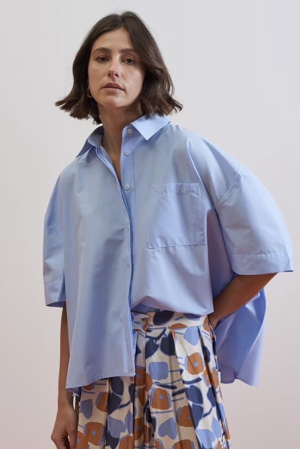 Ένα πουκάμισο που επαναπροσδιορίζει το κλασικό μέσα από μια σύγχρονη, αρχιτεκτονική προσέγγιση. Η καθαρή, χαλαρή γραμμή στο μπροστινό μέρος διατηρεί τη διαχρονική αισθητική ενός tailored κομματιού, με διακριτικές λεπτομέρειες όπως η τσέπη και το ήπια δομημένο μανίκι να προσθέτουν λειτουργικότητα και ισορροπία. Η έκπληξη αποκαλύπτεται στην πλάτη, όπου οι έντονες πιέτες δημιουργούν κίνηση και όγκο, μετατρέποντας το πουκάμισο σε ένα statement piece. Η αντίθεση ανάμεσα στην αυστηρότητα του μπροστινού και τη ρευστότητα της πίσω όψης χαρίζει βάθος και χαρακτήρα, προσδίδοντας μια ανεπιτήδευτη κομψότητα. Ιδανικό για εμφανίσεις που κινούνται ανάμεσα στο refined και το relaxed, το κομμάτι αυτό συνδυάζει λειτουργικό design με μία διακριτικά εντυπωσιακή αισθητική.