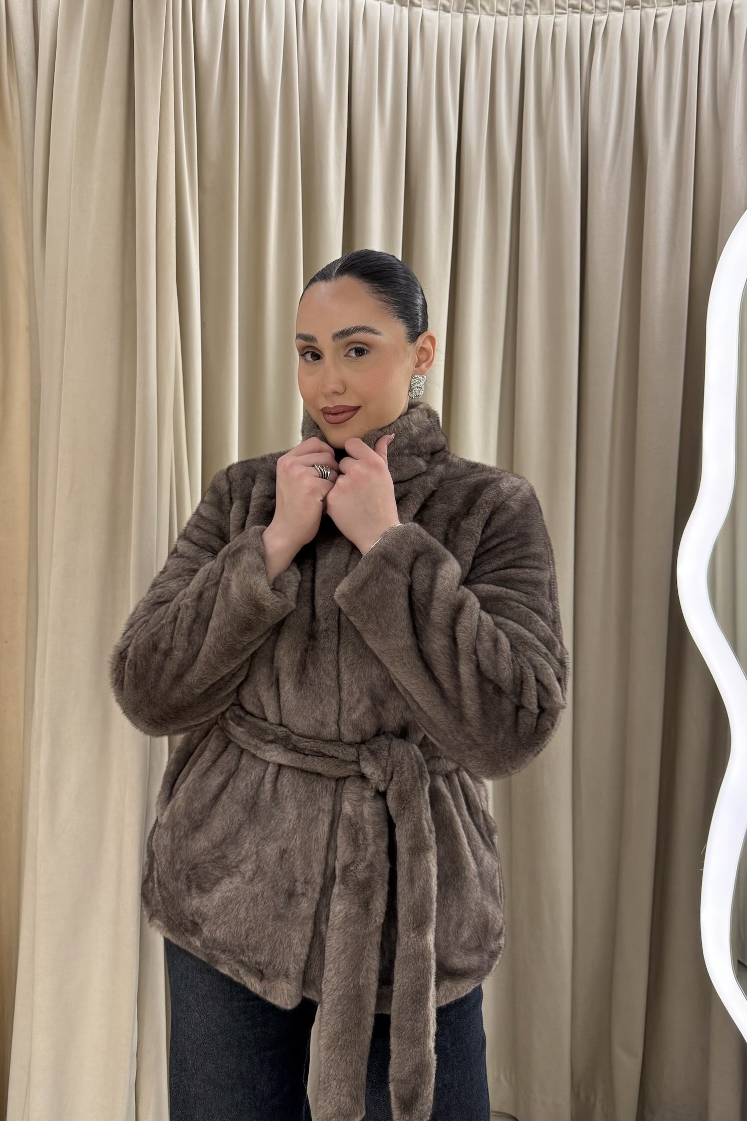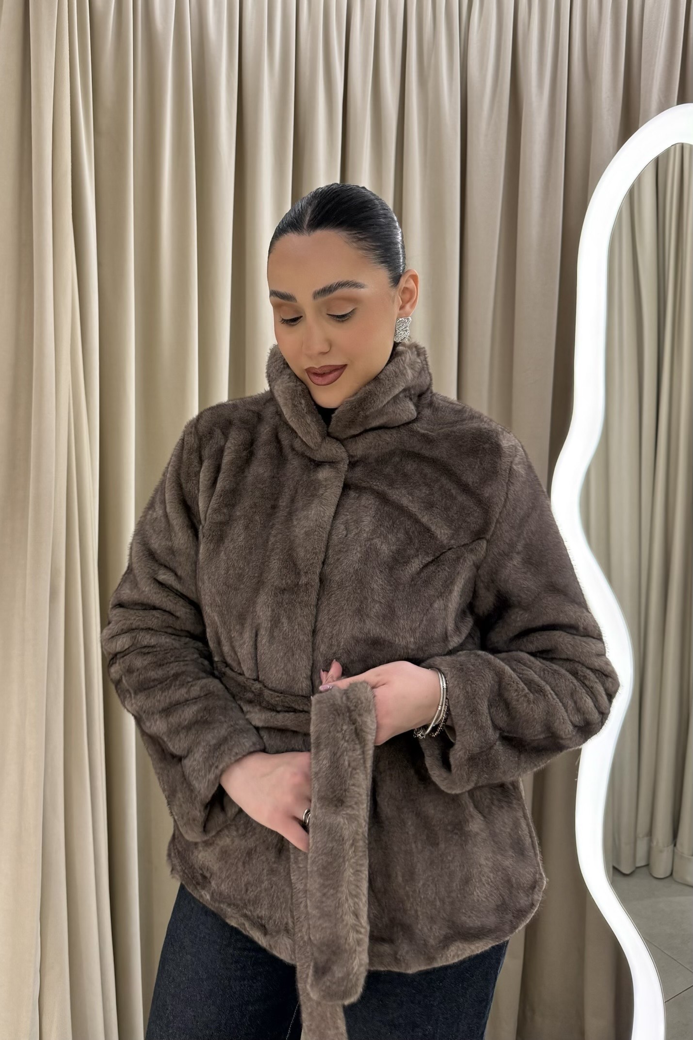Ένα outerwear κομμάτι που αποτυπώνει την έννοια της σύγχρονης πολυτέλειας μέσα από απαλές υφές και χαλαρή κομψότητα. Η plush επιφάνεια αγκαλιάζει το σώμα, δημιουργώντας μια αίσθηση ζεστασιάς και άνεσης, ενώ η ζώνη στη μέση διαμορφώνει τη σιλουέτα με διακριτικό, θηλυκό τρόπο. Η εφαρμογή ισορροπεί ανάμεσα στο relaxed και το refined, επιτρέποντας κίνηση χωρίς να χάνεται η δομή. Ένα κομμάτι που φοριέται σαν statement αλλά λειτουργεί καθημερινά, ολοκληρώνοντας κάθε εμφάνιση με μια αίσθηση effortless chic και διαχρονικής φινέτσας.