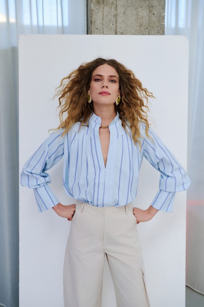 Κλασικό με σύγχρονη ματιά, το ριγέ πουκάμισο με βαθύ V άνοιγμα προσφέρει relaxed κομψότητα. Η άνετη γραμμή και οι διακριτικές λεπτομέρειες το καθιστούν ιδανικό για tailored ή πιο casual συνδυασμούς, δημιουργώντας looks με ανεπιτήδευτο στιλ.