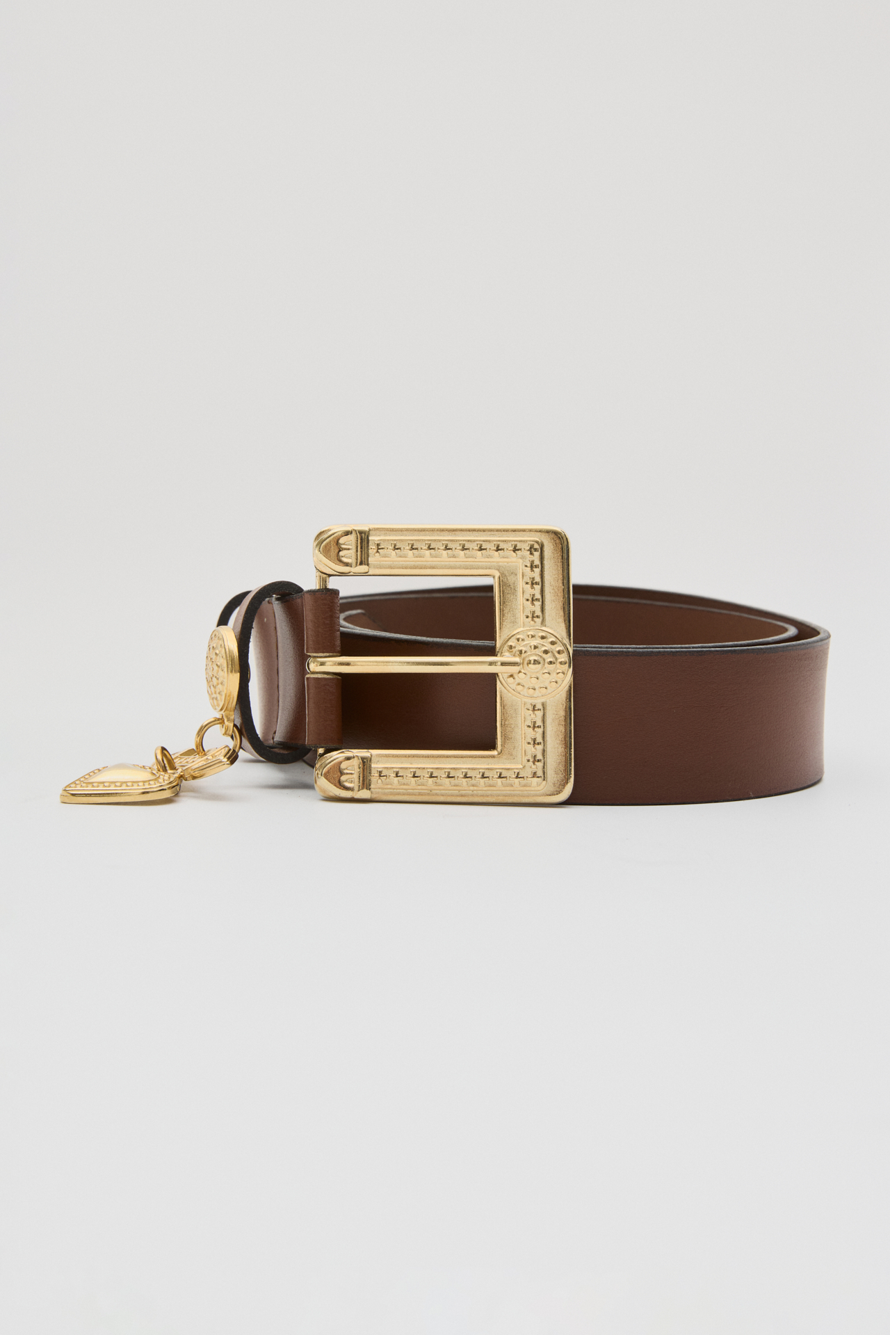 Η καφέ ζώνη με τη γεωμετρική χρυσή αγκράφα και τα κρεμαστά διακοσμητικά charms σε σχήμα καρδιάς και σφραγίδας είναι το απόλυτο statement αξεσουάρ. Οι ανάγλυφες λεπτομέρειες στη μεταλλική επιφάνεια χαρίζουν μια vintage πολυτέλεια, ενώ τα χρυσά στοιχεία δημιουργούν μια αίσθηση κομψότητας και θηλυκότητας. Ιδανική για να αναδείξει τη μέση σε φορέματα, παντελόνια ή σακάκια, προσθέτοντας μοναδικό χαρακτήρα σε κάθε εμφάνιση.
