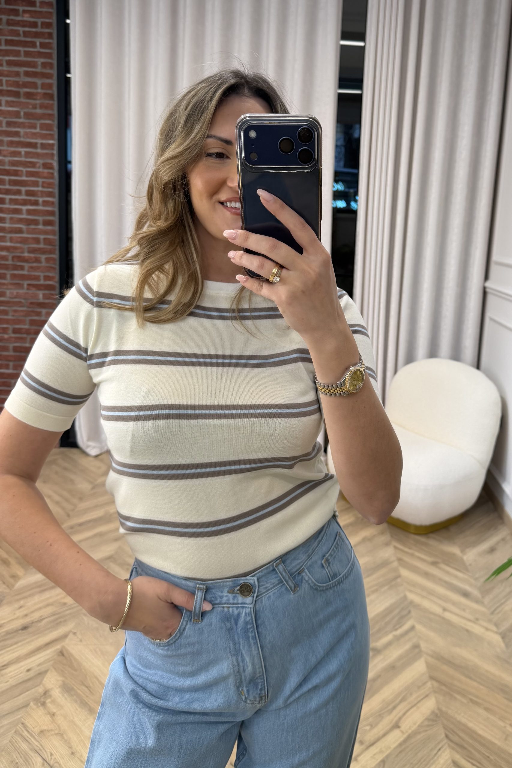 Minimal και ευκολοφόρετο, αυτό το πλεκτό κοντομάνικο ξεχωρίζει για την καθαρή γραμμή και τη διαχρονική του αισθητική. Η ίσια εφαρμογή και η λεπτή πλέξη το καθιστούν ιδανικό για all-day εμφανίσεις, ενώ λειτουργεί τέλεια ως βάση για πιο statement κομμάτια.