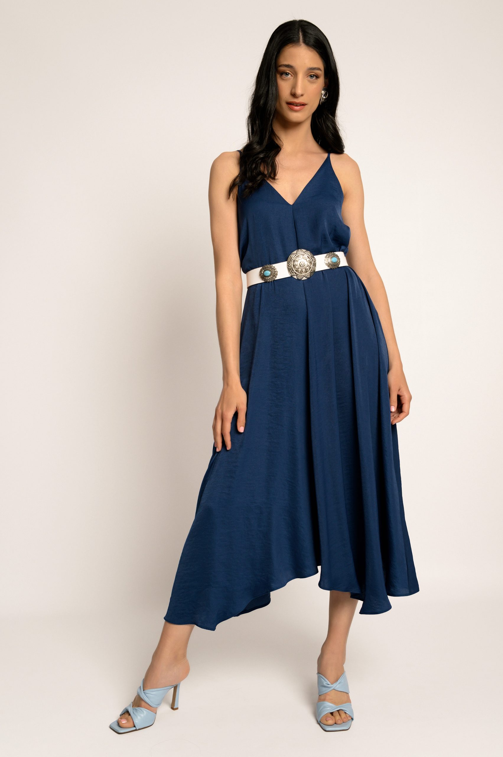 Ένα φόρεμα που αποτυπώνει την ουσία της διαχρονικής θηλυκότητας μέσα από μια σύγχρονη, ρευστή αισθητική. Η ανάλαφρη γραμμή του αγκαλιάζει απαλά το σώμα, δημιουργώντας μια σιλουέτα που κινείται με φυσική χάρη και κομψότητα, ενώ το βαθύ ντεκολτέ αναδεικνύει διακριτικά το μπούστο, προσθέτοντας μια αίσθηση εκλεπτυσμένου αισθησιασμού. Η μέση τονίζεται μέσα από την υφασμάτινη ζώνη, η οποία δένει απαλά και διαμορφώνει το σώμα χωρίς να περιορίζει, χαρίζοντας ισορροπία ανάμεσα στη δομή και την ελευθερία κίνησης. Το ύφασμα πέφτει ρευστά, δημιουργώντας απαλές πτυχώσεις που ζωντανεύουν σε κάθε βήμα, ενώ το ασύμμετρο τελείωμα προσθέτει μια σύγχρονη, ανεπιτήδευτη δυναμική στο σύνολο. Ιδανικό για εμφανίσεις που απαιτούν κομψότητα χωρίς προσπάθεια, αυτό το φόρεμα προσαρμόζεται εύκολα από πιο καθημερινές στιγμές έως πιο ιδιαίτερες περιστάσεις, αποπνέοντας έναν αέρα διακριτικής πολυτέλειας και φυσικής αυτοπεποίθησης.