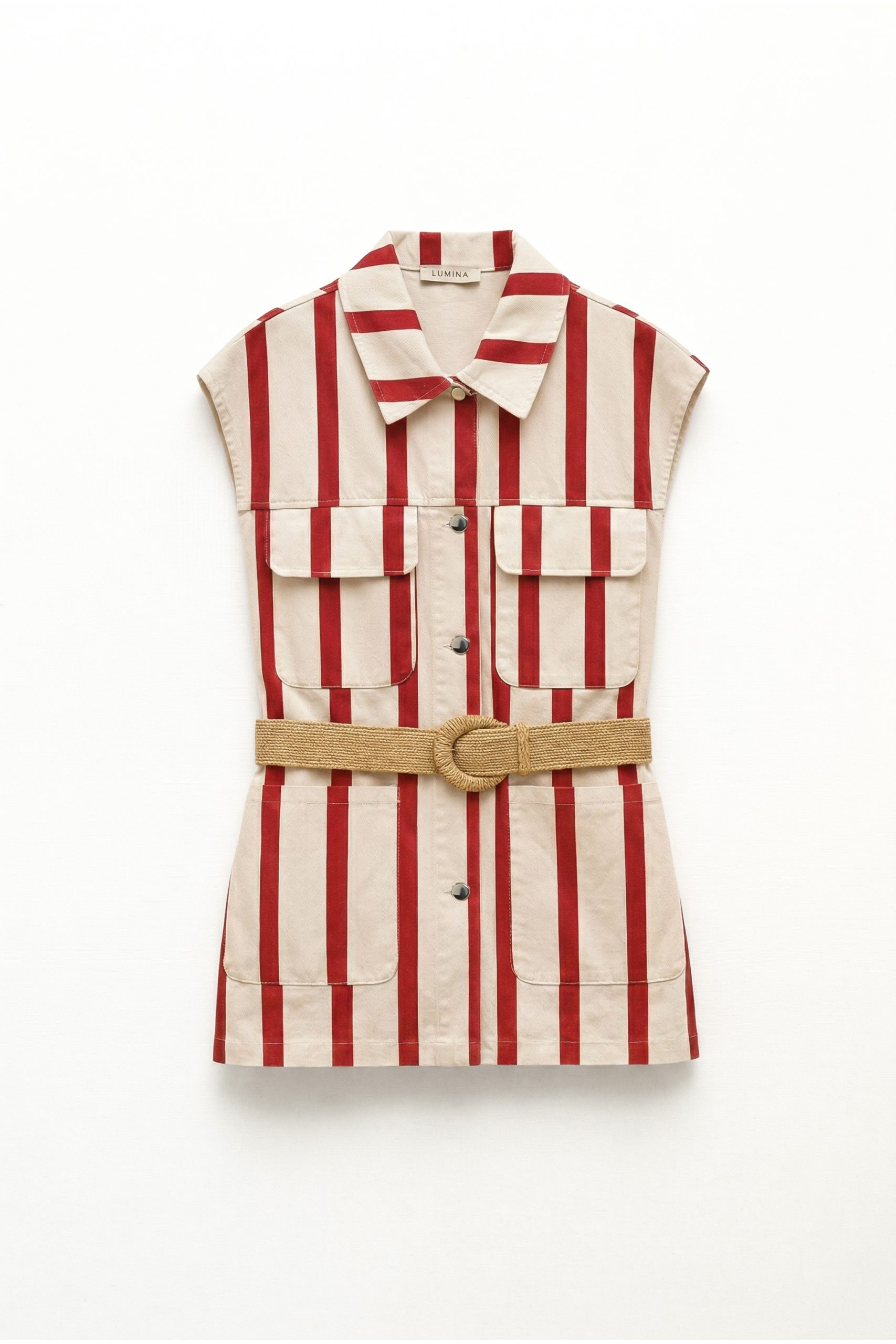 Αναδείξτε το καλοκαιρινό σας στυλ με αυτό το κομψό γυναικείο αμάνικο φόρεμα-γιλέκο, που συνδυάζει διαχρονικό design με μοντέρνες λεπτομέρειες. Το ιδιαίτερο ριγέ μοτίβο σε κόκκινο και εκρού αποχρώσεις προσφέρει φρεσκάδα και κομψότητα, ιδανική για κάθε περίσταση. Διαθέτει γιακά πουκαμίσου και κουμπιά σε όλο το μήκος, προσφέροντας πρακτικότητα και ευελιξία στο styling. Οι μεγάλες μπροστινές τσέπες προσθέτουν λειτουργικό χαρακτήρα, ενώ η ζώνη στη μέση τονίζει τη σιλουέτα και χαρίζει θηλυκή γραμμή. Φορέστε το από το πρωί μέχρι το βράδυ, με σανδάλια για casual εμφανίσεις ή με πιο κομψά αξεσουάρ για ένα προσεγμένο look. Ένα ευέλικτο και στιλάτο κομμάτι που δεν πρέπει να λείπει από τη συλλογή σας.