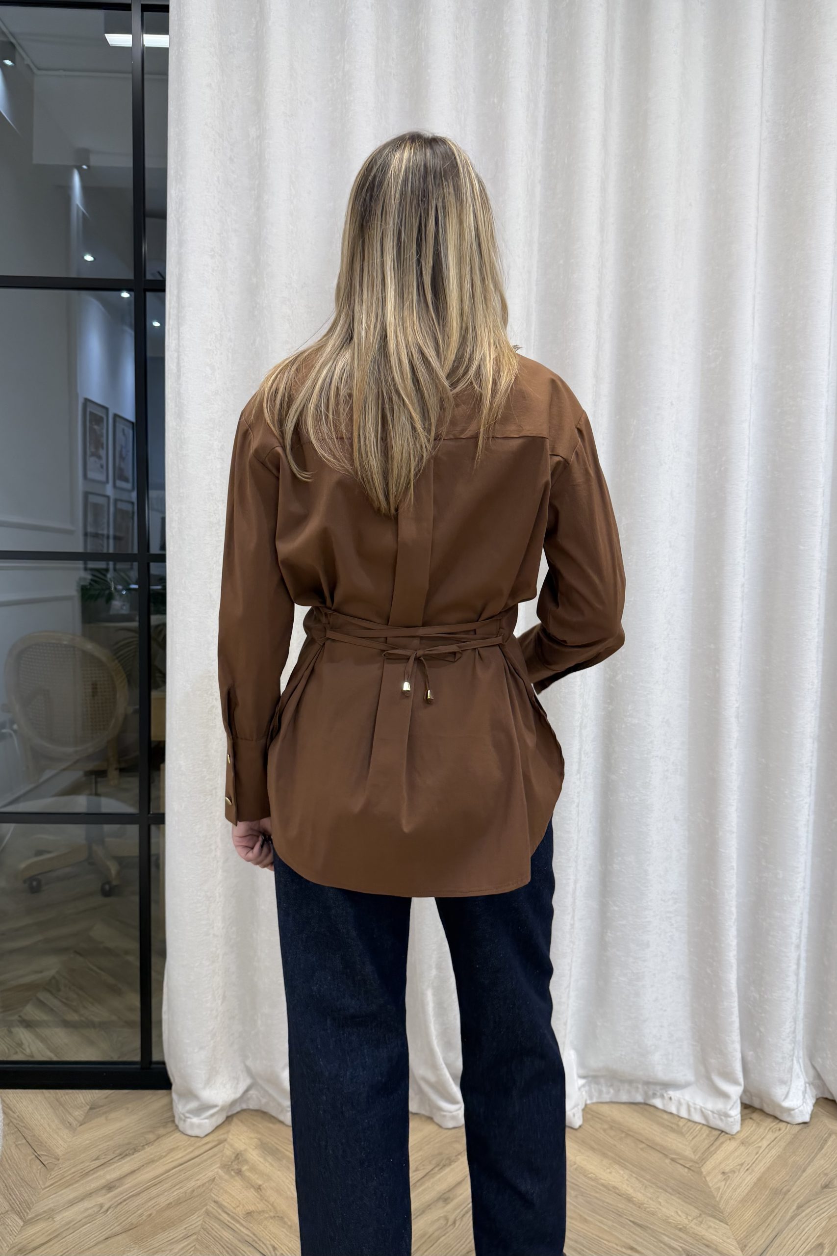Minimal αλλά με fashion twist — το καφέ πουκάμισο απογειώνεται μέσα από τη διαχρονική του γραμμή και τη θηλυκή λεπτομέρεια δεσίματος στο πίσω μέρος. Το structured ύφασμά του αγκαλιάζει το σώμα με κομψότητα, ενώ το ρυθμιζόμενο κορδόνι στη μέση αναδεικνύει τη σιλουέτα δημιουργώντας ένα άψογα ισορροπημένο αποτέλεσμα. Ιδανικό τόσο για office looks όσο και για πιο relaxed εμφανίσεις, αποτελεί το απόλυτο must-have κομμάτι της γκαρνταρόμπας.