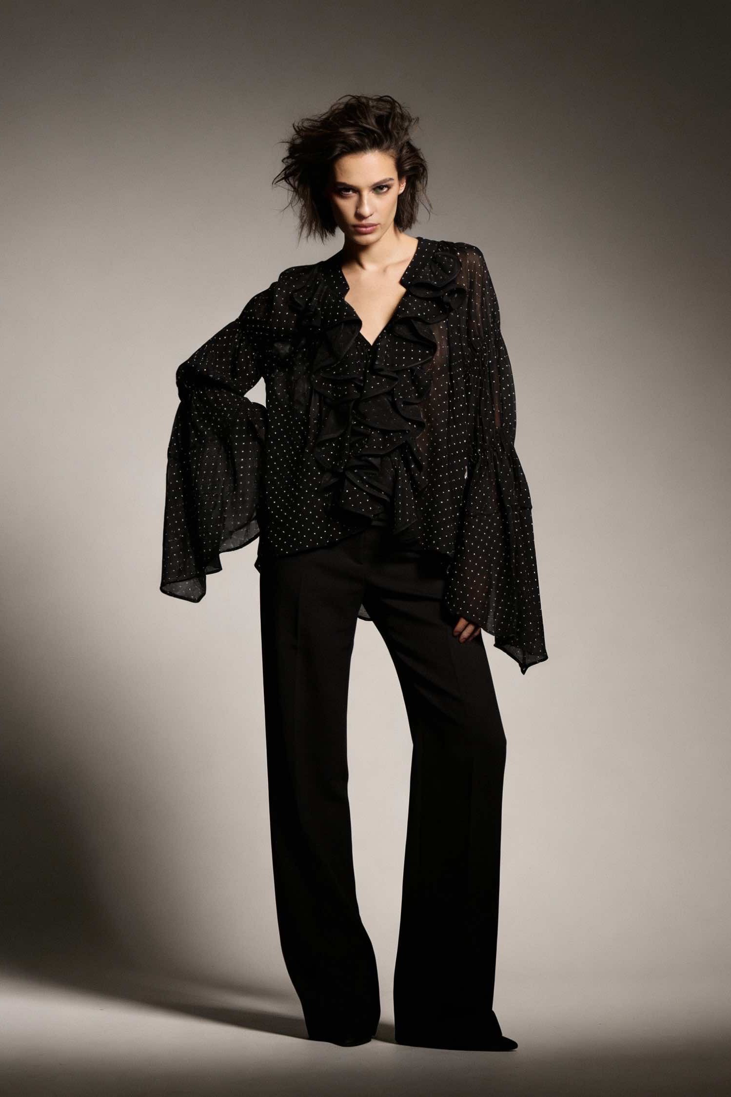 Top με έντονη editorial ταυτότητα που κινείται ανάμεσα στη θηλυκότητα και το σκοτεινό ρομαντισμό. Η ανάλαφρη, διάφανη υφή δημιουργεί μια αίσθηση κίνησης, ενώ τα διαδοχικά βολάν στο μπροστινό μέρος χτίζουν βάθος και δραματικότητα χωρίς υπερβολή. Η χαλαρή εφαρμογή και τα φαρδιά μανίκια προσθέτουν αέρα ανεπιτήδευτης πολυτέλειας, αφήνοντας το σώμα να κινείται ελεύθερα. Ένα κομμάτι που λειτουργεί ως statement, ισορροπώντας την ένταση με την κομψότητα και μεταφέροντας μια ατμόσφαιρα σύγχρονης, νυχτερινής δύναμης.