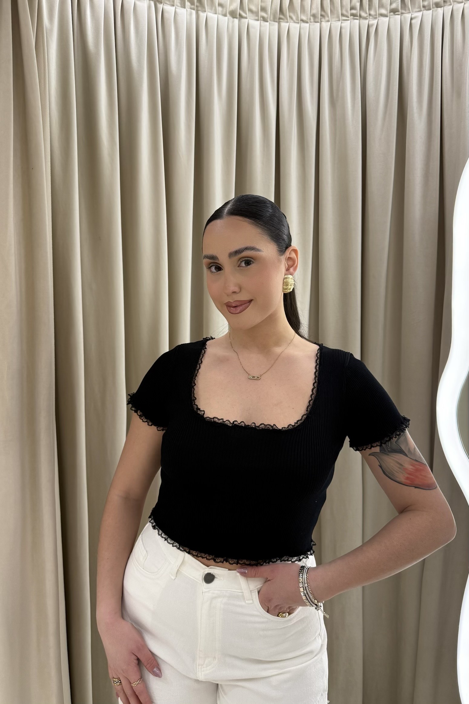 Ένα κομμάτι που ισορροπεί ανάμεσα στη θηλυκότητα και τη σύγχρονη απλότητα. Η εφαρμοστή rib υφή αγκαλιάζει το σώμα, ενώ οι διακριτικές τελειώσεις με δαντέλα προσθέτουν μια ρομαντική, σχεδόν εσώρουχη αίσθηση. Ιδανικό για layered εμφανίσεις ή φορεμένο μόνο του ως statement.