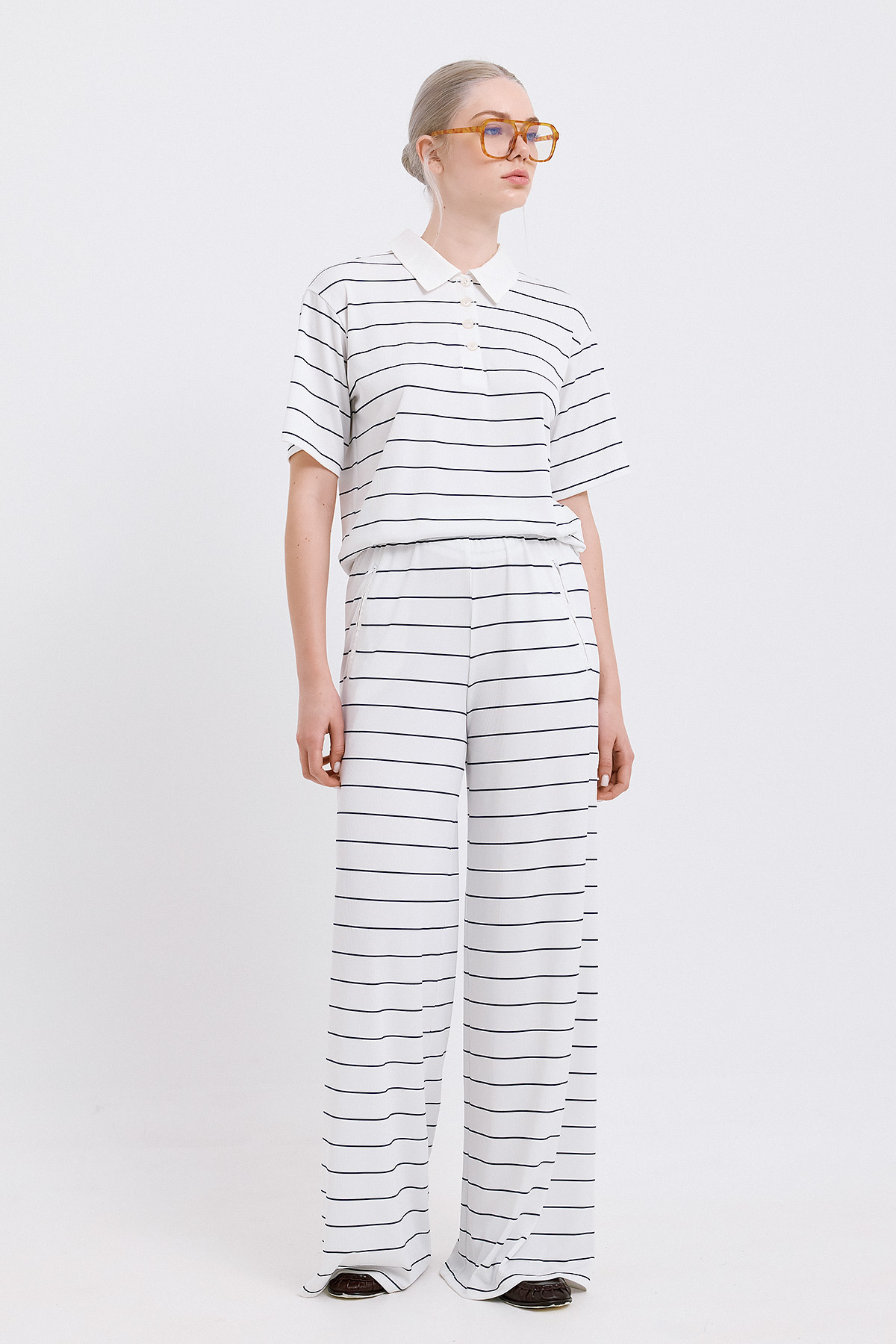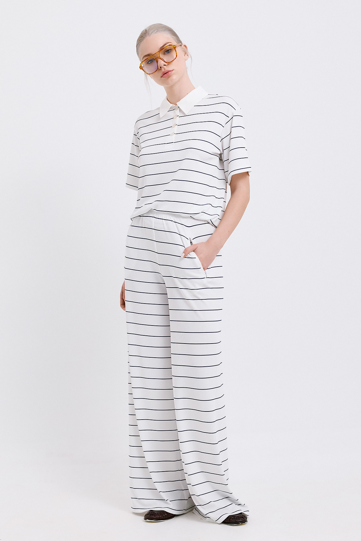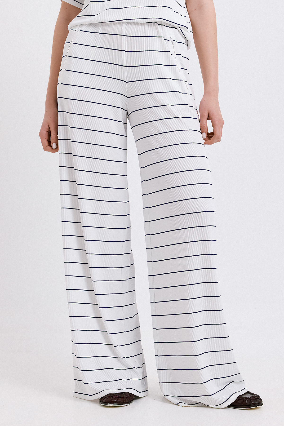 Άνετο παντελόνι με φαρδιά γραμμή και διαχρονικό navy χρώμα με λεπτές λευκές ρίγες. Η ελαστική μέση προσφέρει ευκολία στην εφαρμογή, ενώ το ύφασμα έχει απαλή υφή και φυσική κίνηση. Ένα κομμάτι ιδανικό για casual chic looks που μπορούν να μεταφερθούν από το πρωί έως το βράδυ. Συνδυάζεται τέλεια με το αντίστοιχο top της ίδιας σειράς για ένα ολοκληρωμένο σετ με relaxed αλλά προσεγμένη αισθητική.
