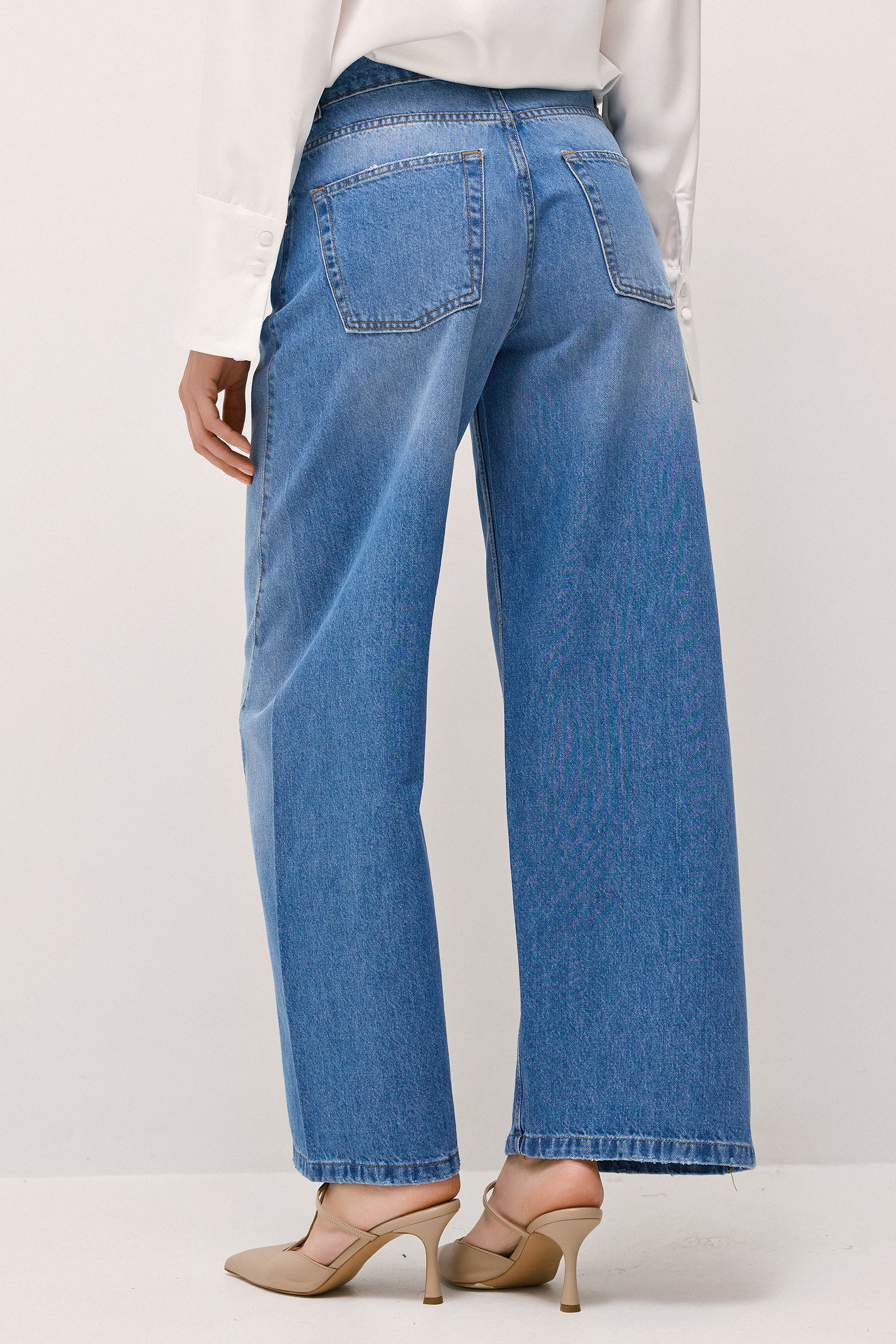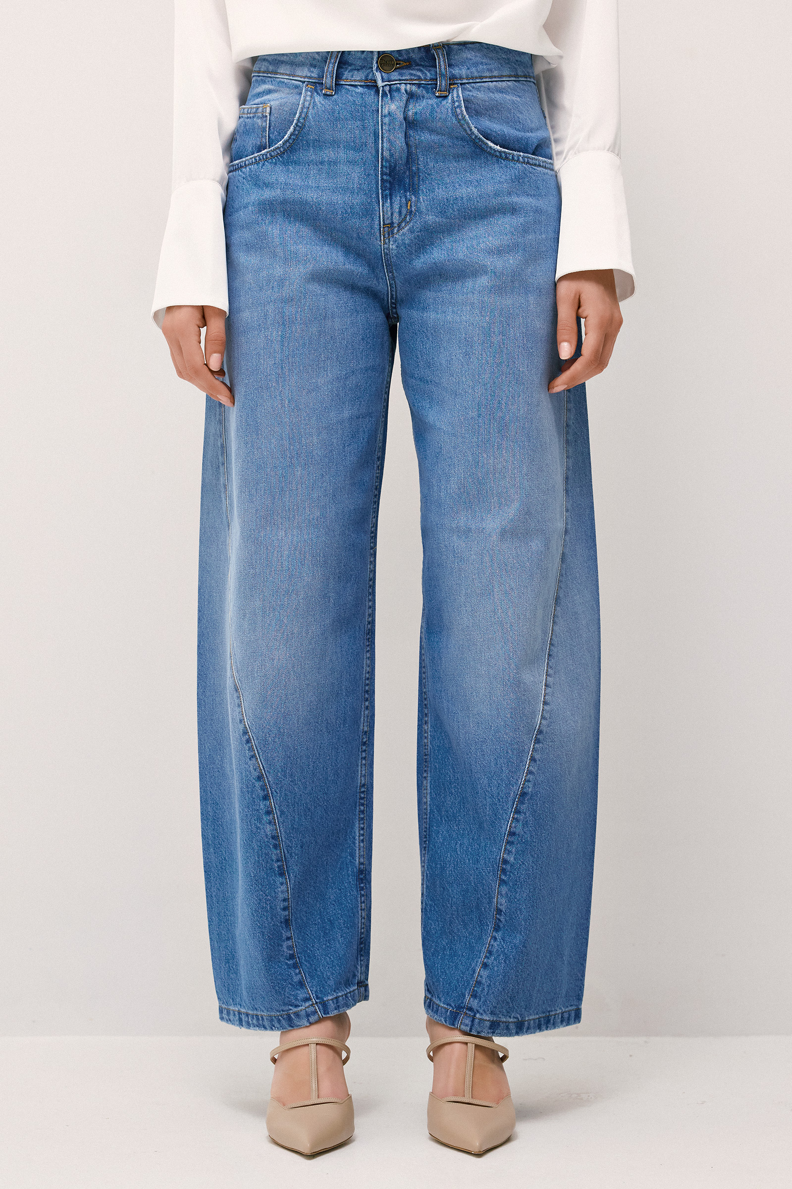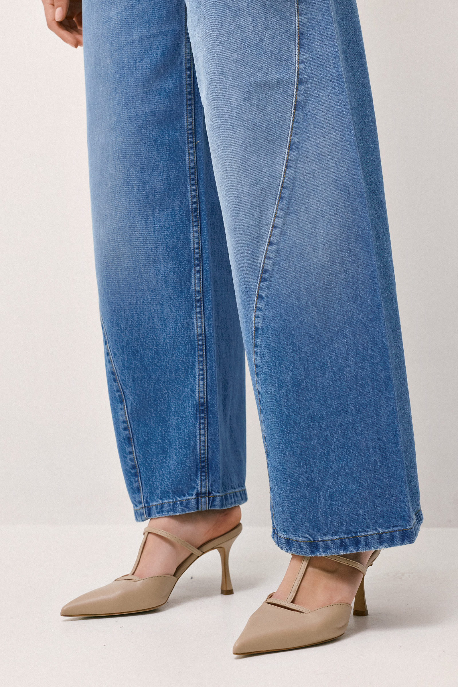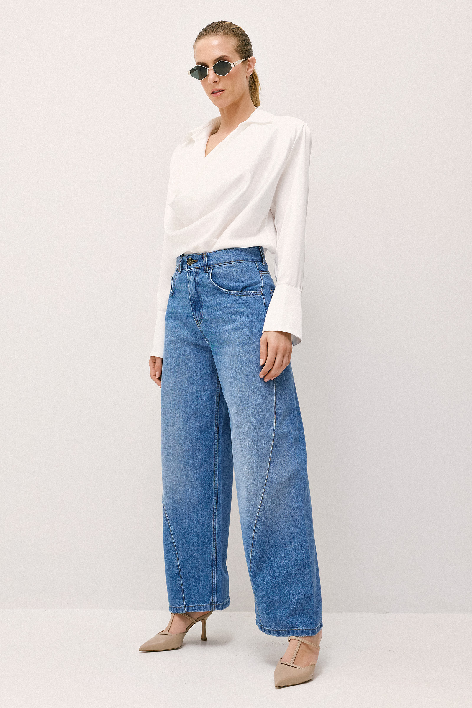 Τζιν παντελόνι με σύγχρονη, relaxed γραμμή που δημιουργεί μια ισορροπημένη και κομψή σιλουέτα. Η εφαρμογή στη μέση αγκαλιάζει διακριτικά το σώμα, ενώ η φαρδιά γραμμή των ποδιών προσδίδει άνεση και φυσική κίνηση στο σχέδιο. Οι καθαρές ραφές και η προσεγμένη κατασκευή του denim αναδεικνύουν τη δομή του παντελονιού, ενώ η απαλή πτώση του υφάσματος δημιουργεί μια δυναμική αλλά ανεπιτήδευτη αισθητική. Η φαρδιά γραμμή στα πόδια προσθέτει μοντέρνο χαρακτήρα και ενισχύει τη σύγχρονη σιλουέτα του σχεδίου. Ένα κομμάτι που συνδυάζει τη διαχρονικότητα του denim με μια σύγχρονη προσέγγιση στη γραμμή, ιδανικό για εμφανίσεις που ισορροπούν ανάμεσα στην άνεση και την εκλεπτυσμένη καθημερινή κομψότητα.