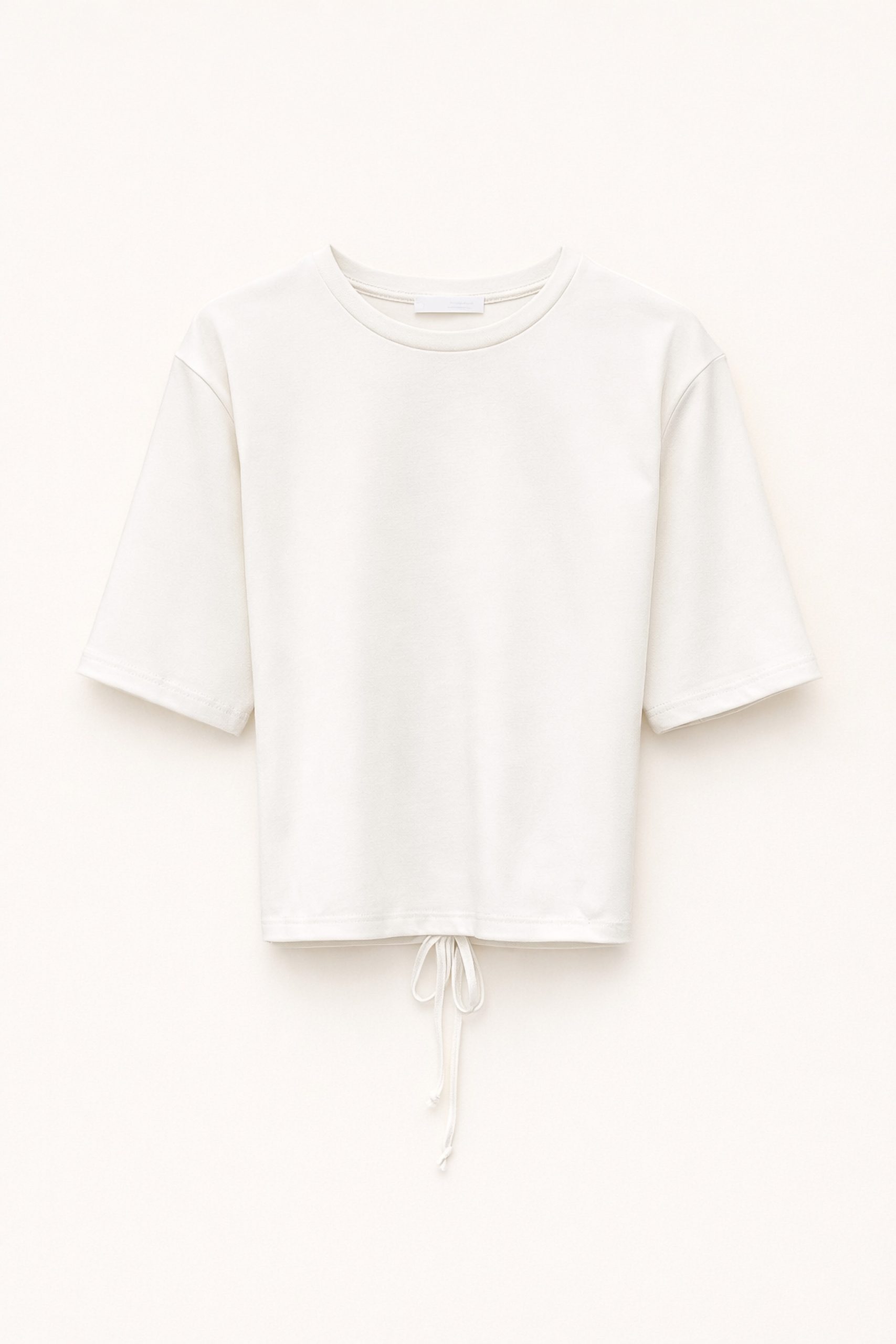 Το συγκεκριμένο T-shirt επαναπροσδιορίζει το basic κομμάτι μέσα από μια σύγχρονη, αρχιτεκτονική προσέγγιση. Μπροστά διατηρεί μια καθαρή, μίνιμαλ αισθητική με relaxed γραμμή, στρογγυλή λαιμόκοψη και μανίκια που πέφτουν απαλά, δημιουργώντας μια ισορροπημένη, effortless σιλουέτα. Πίσω, όμως, αποκαλύπτεται η ανατροπή: ένα κορσέ-inspired δέσιμο στη μέση με διακριτικά κορδόνια που σχηματίζουν χιαστί γραμμές, αγκαλιάζοντας το σώμα και επιτρέποντας ρυθμιζόμενη εφαρμογή. Η αντίθεση ανάμεσα στο minimal μπροστινό μέρος και τη δυναμική πλάτη δημιουργεί ένα κομμάτι με dual χαρακτήρα — απλό με την πρώτη ματιά, statement στη λεπτομέρεια. Ένα T-shirt που συνδυάζει άνεση και θηλυκότητα, ιδανικό για σύγχρονα looks με subtle ένταση.