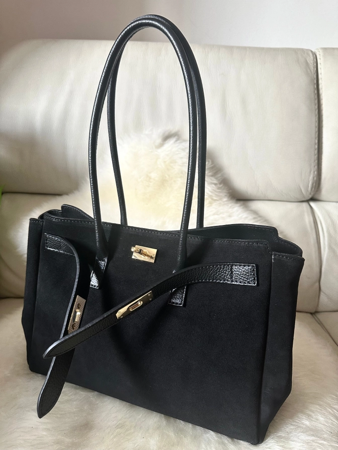 Μεγάλη τσάντα ώμου από γνήσιο σουέτ δέρμα, εξ ολοκλήρου χειροποίητη. Κατασκευασμένη στην Ιταλία. Η τσάντα έχει πλαϊνά κουμπιά για να είναι πιο ευρύχωρη. Στο εσωτερικό, είναι επενδυμένη και κλείνει με φερμουάρ. Ιδανική για καθημερινή χρήση, για τη δουλειά ή το πανεπιστήμιο. Μπορεί να φορεθεί με διάφορους τρόπους, ανάλογα με τον τρόπο ρύθμισης των λουριών, είτε πιο κλασική είτε πιο ροκ.