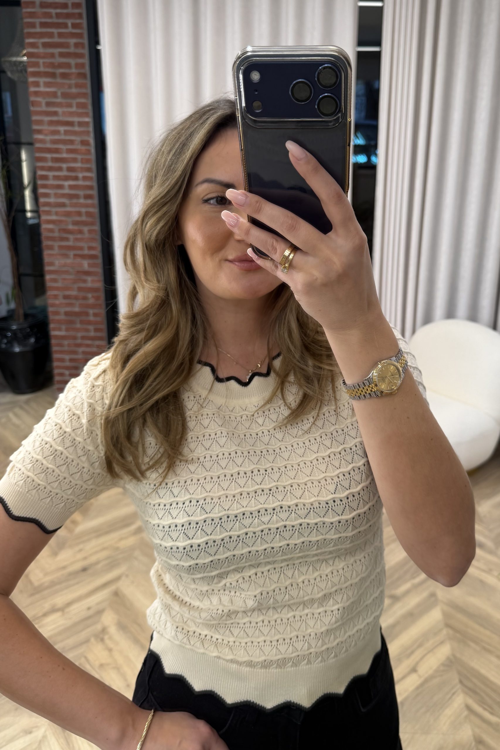 Ένα statement πλεκτό με ιδιαίτερο διάτρητο σχέδιο που προσθέτει βάθος και υφή. Η cropped γραμμή και το παιχνιδιάρικο τελείωμα χαρίζουν σύγχρονο χαρακτήρα, ενώ παραμένει άνετο και ευκολοφόρετο. Ιδανικό για layering ή solo εμφανίσεις.