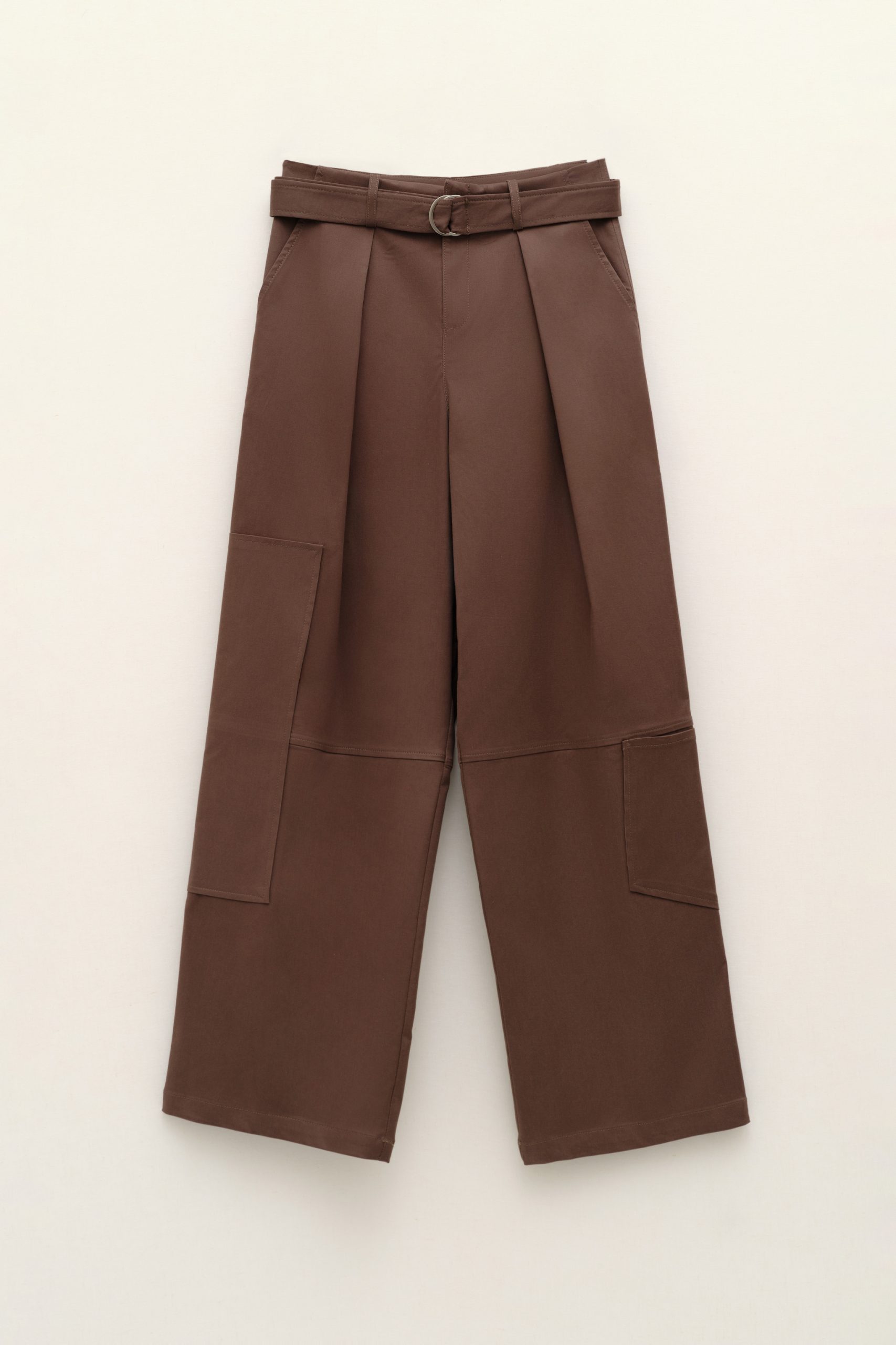 Το ψηλόμεσο παντελόνι σε πλούσια σοκολατί απόχρωση αποτελεί μια σύγχρονη ωδή στη γήινη κομψότητα, αποπνέοντας διακριτική πολυτέλεια και δυναμισμό. Η φαρδιά, cropped γραμμή του χαρίζει κίνηση και αρχιτεκτονική καθαρότητα στη σιλουέτα, ενώ οι διακριτικές πιέτες στο μπροστινό μέρος προσθέτουν δομή και αναδεικνύουν τη μέση με φυσικό τρόπο. Η ζώνη από το ίδιο ύφασμα με μεταλλική αγκράφα τονίζει κομψά το σημείο, ενώ τα statement patch pockets ενισχύουν τον σύγχρονο, ελαφρώς utilitarian χαρακτήρα του. Το σταθερό αλλά άνετο ύφασμα επιτρέπει στο παντελόνι να διατηρεί τη φόρμα του, δημιουργώντας ένα refined αποτέλεσμα με έντονη προσωπικότητα, ιδανικό για σύνολα που ισορροπούν ανάμεσα στο tailored και το contemporary ύφος.