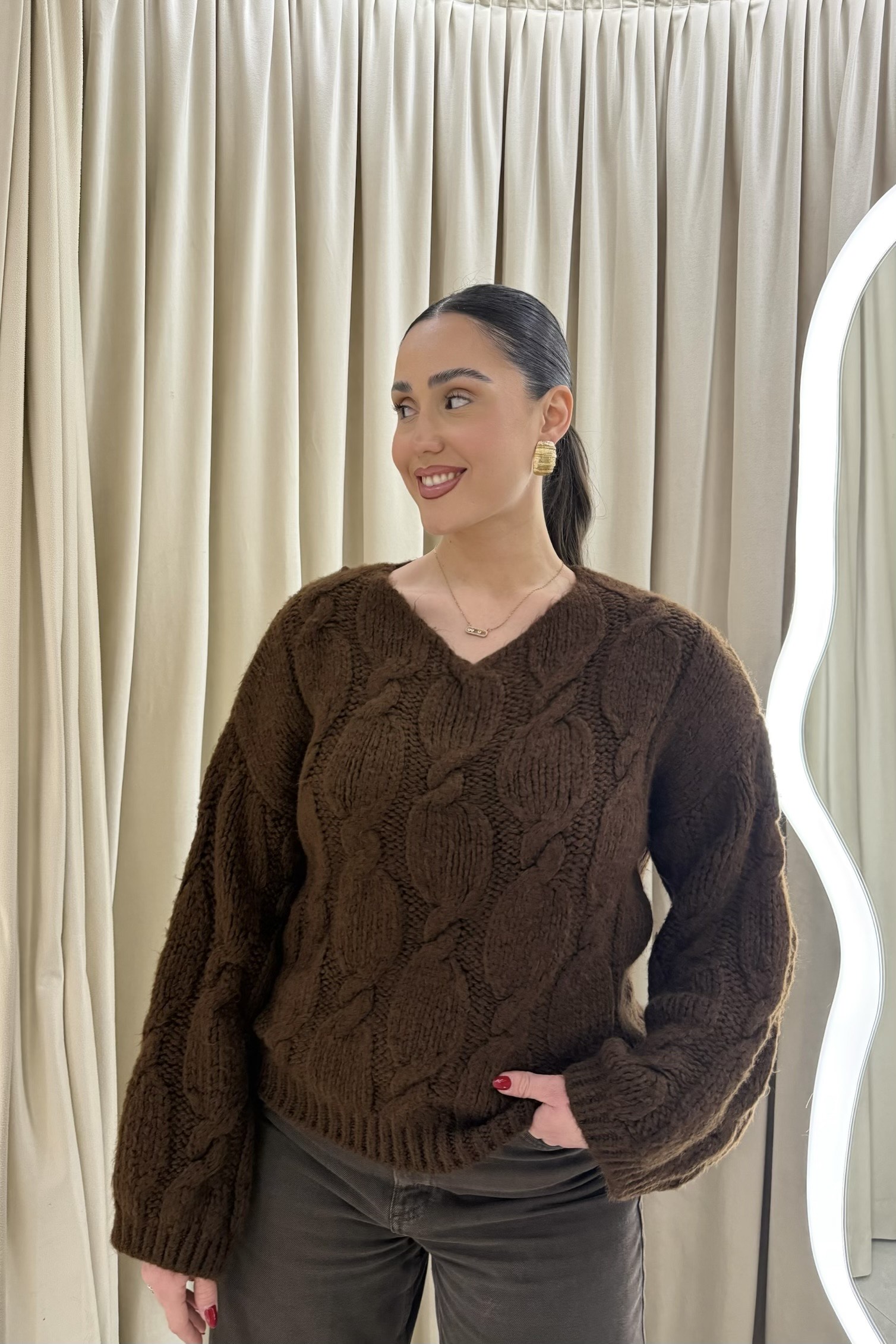 Ένα statement πλεκτό με έντονο ανάγλυφο χαρακτήρα, που συνδυάζει την αίσθηση του χειροποίητου με σύγχρονη αισθητική. Η πλούσια πλέξη και το διαχρονικό cable σχέδιο δημιουργούν βάθος και υφή, ενώ η χαλαρή γραμμή προσφέρει άνεση χωρίς να χάνει σε κομψότητα. Το V ντεκολτέ φωτίζει τη σιλουέτα και προσθέτει θηλυκή ισορροπία στο δυναμικό design. Ένα knitwear κομμάτι ιδανικό για effortless εμφανίσεις με cozy αλλά επιμελημένο ύφος, που λειτουργεί ως βασικός πρωταγωνιστής σε μια σύγχρονη γκαρνταρόμπα.
