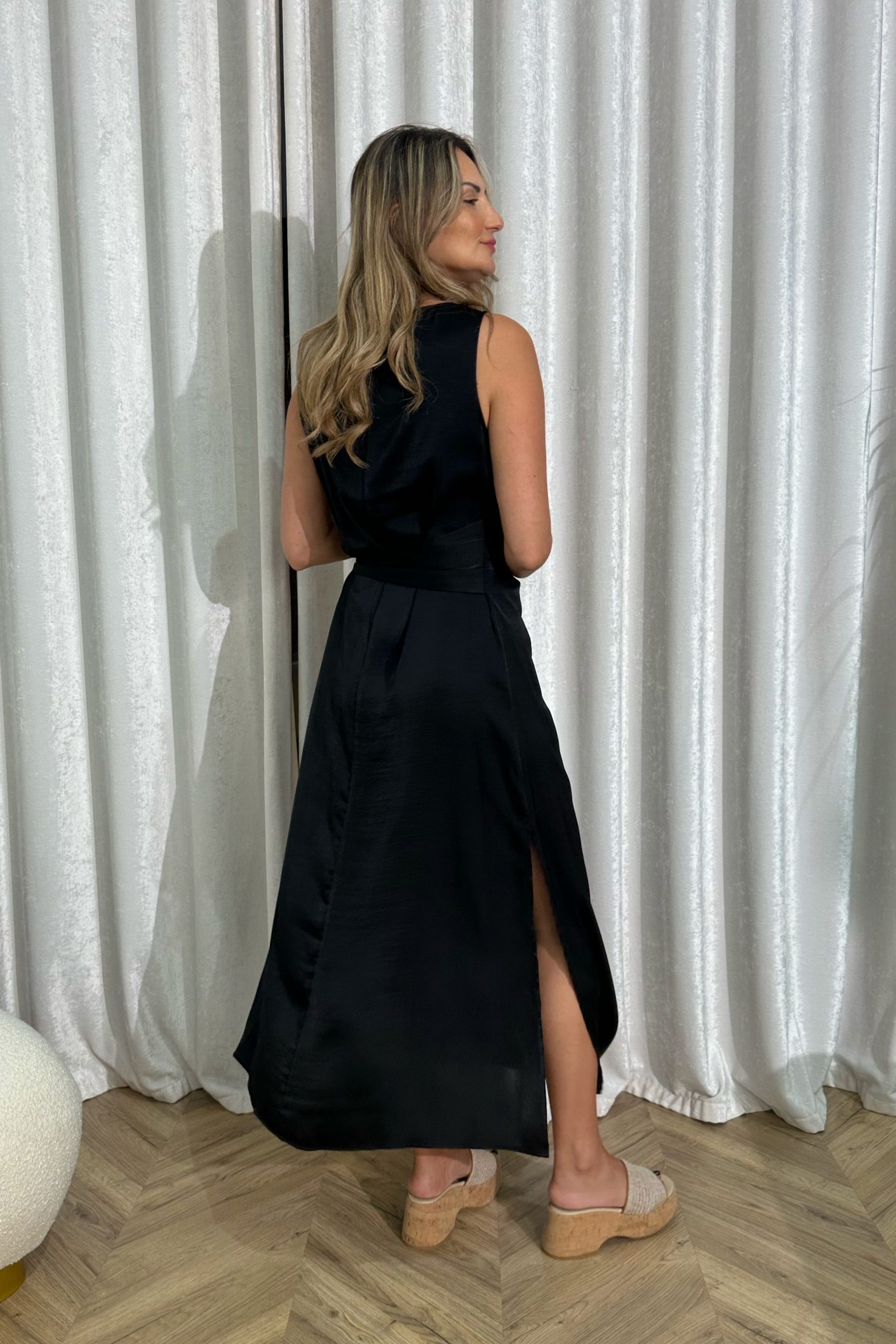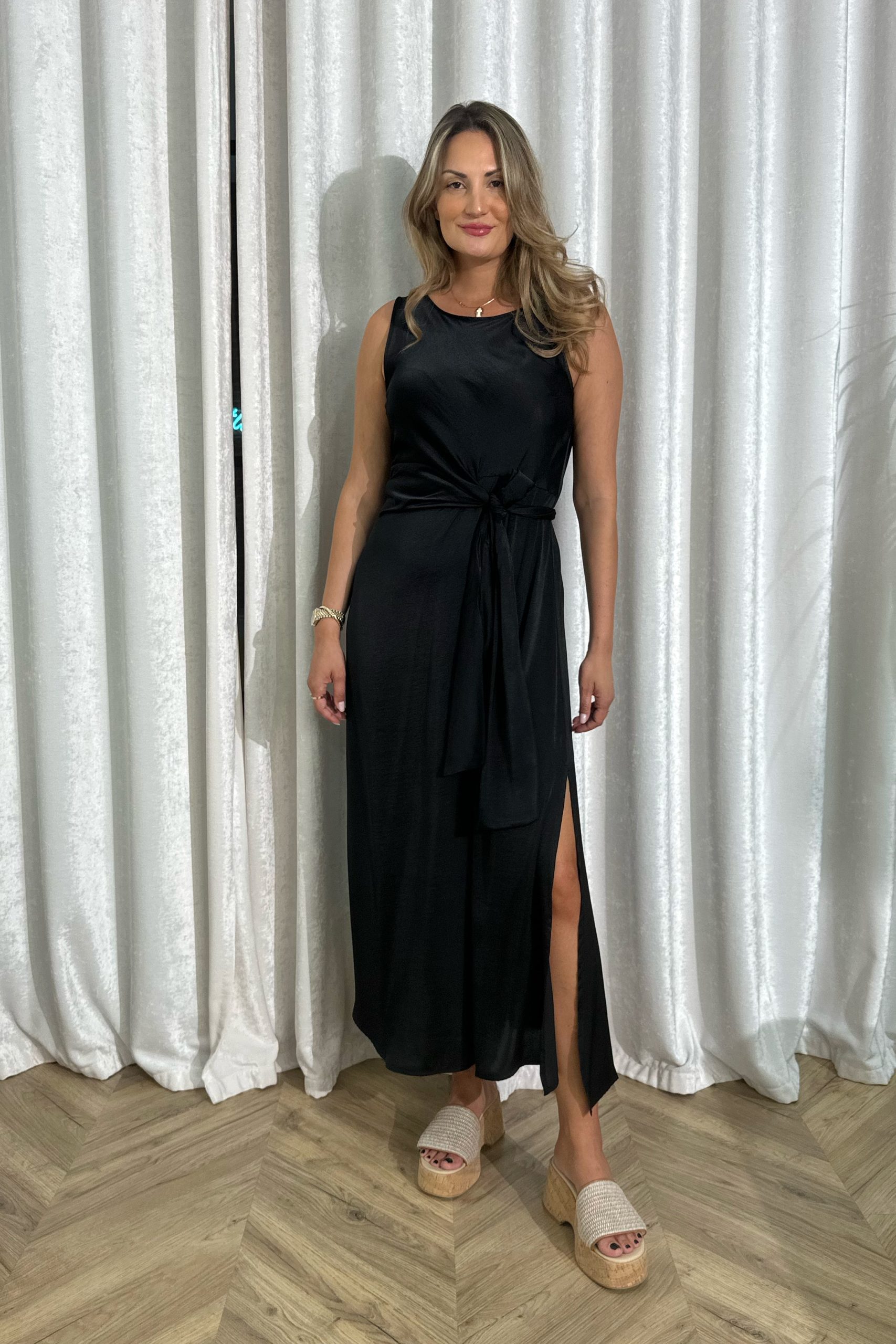 Το επάνω μέρος χαρακτηρίζεται από μια λιτή, στρογγυλή λαιμόκοψη που δίνει έμφαση στη φυσικότητα, ενώ η απουσία έντονων στοιχείων ενισχύει την αίσθηση διαχρονικότητας. Η μέση αναδεικνύεται μέσα από μια απαλή δέση στο πλάι, που δεν λειτουργεί μόνο ως διακοσμητικό στοιχείο αλλά και ως σημείο που προσθέτει κίνηση και ροή στο ένδυμα. Η φούστα πέφτει κάθετα με ρευστότητα, ακολουθώντας τη γραμμή του σώματος και ανοίγοντας διακριτικά μέσα από το σκίσιμο, το οποίο προσθέτει μια ανεπιτήδευτη θηλυκότητα και ελευθερία στην κίνηση. Το ύφασμα αντανακλά απαλά το φως, δημιουργώντας μια φίνα υφή που ζωντανεύει σε κάθε βήμα. Ένα κομμάτι που ισορροπεί ανάμεσα στο χαλαρό και το εκλεπτυσμένο, ιδανικό για εμφανίσεις που θέλουν να δείχνουν φυσικές αλλά ταυτόχρονα προσεγμένες, χωρίς καμία υπερβολή.