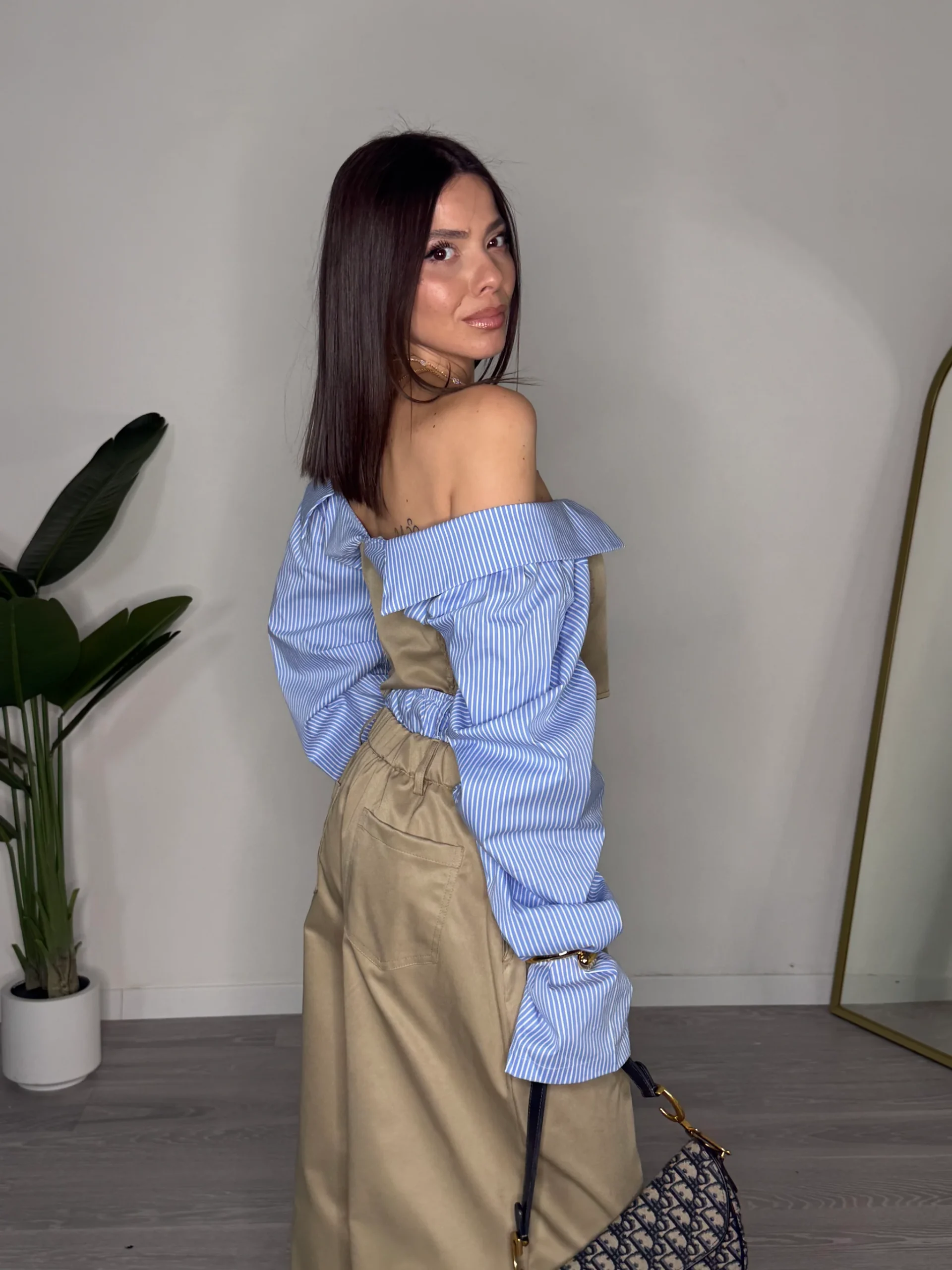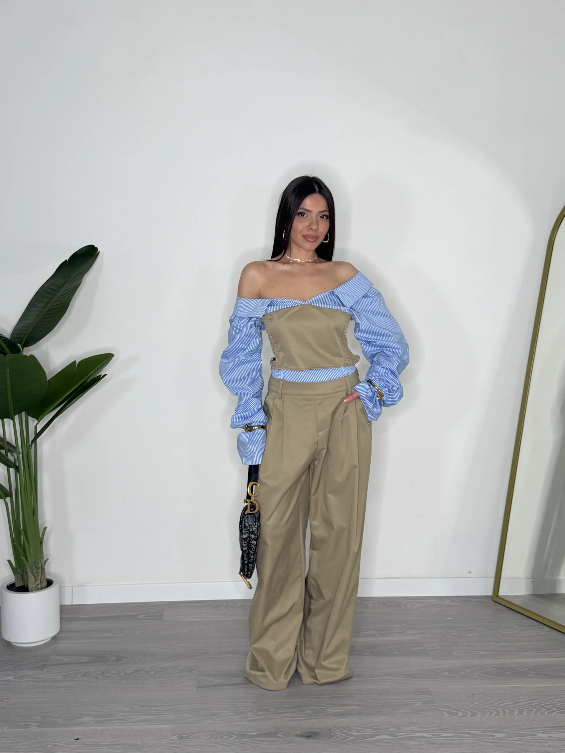 Ένα σύνολο που εξερευνά την ισορροπία ανάμεσα στο tailoring και τη ρευστότητα. Το off-shoulder top αναδεικνύει τη σιλουέτα μέσα από καθαρές γραμμές και αρχιτεκτονική εφαρμογή, ενώ τα ανάλαφρα μανίκια προσθέτουν κίνηση και αντίθεση στην κατασκευή. Το παντελόνι, με φαρδιά γραμμή και άψογη πτώση, ολοκληρώνει το look με μια αίσθηση διαχρονικής κομψότητας και δυναμισμού. Ένα editorial σύνολο που προσαρμόζεται εύκολα, αποπνέοντας αυτοπεποίθηση και σύγχρονο χαρακτήρα, ιδανικό για εμφανίσεις με ξεκάθαρη fashion ταυτότητα.