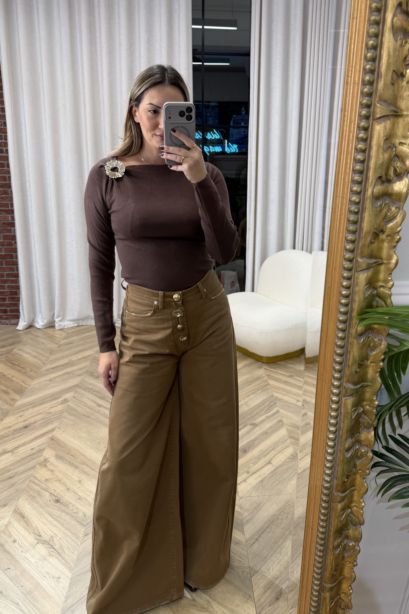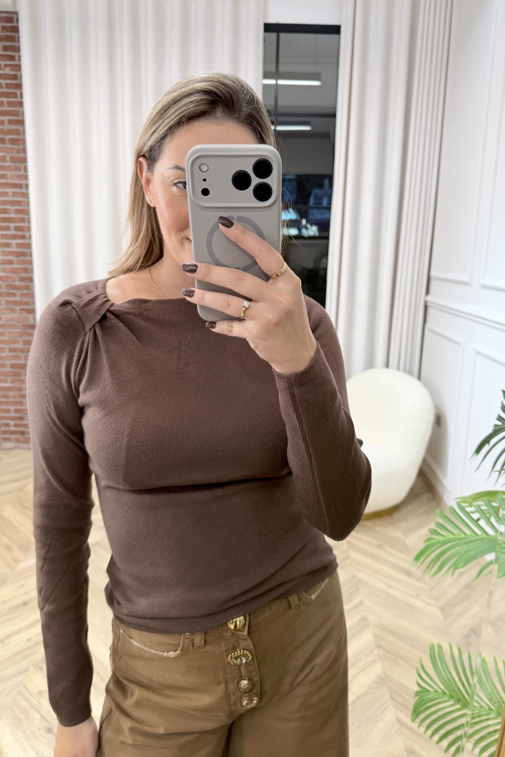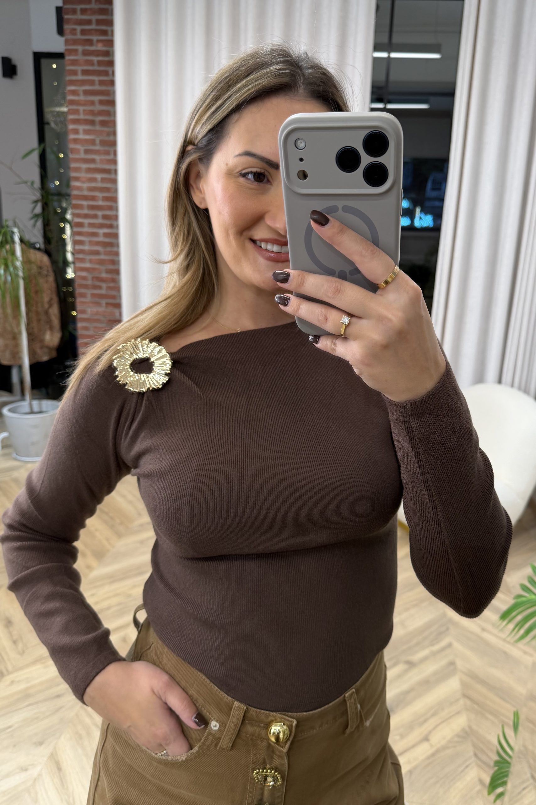 Το τοπ αποπνέει μια ήσυχη αλλά απόλυτη κομψότητα, με εκείνο το είδος της απλότητας που τραβά το βλέμμα χωρίς καμία υπερβολή. Η γραμμή του αγκαλιάζει διακριτικά το σώμα, προσφέροντας μια εκλεπτυσμένη θηλυκότητα, ενώ η λαιμόκοψη πέφτει ελαφρώς στο πλάι δημιουργώντας έναν ανεπιτήδευτο, σύγχρονο αισθησιασμό. Η εντυπωσιακή μεταλλική λεπτομέρεια στον ώμο λειτουργεί σαν μικρό κόσμημα, μια sculptural πινελιά που μεταμορφώνει ολόκληρο το σύνολο. Δίνει την αίσθηση ότι το ρούχο δεν φοριέται απλώς—επιμελείται. Ένα statement top που συνδυάζει μινιμαλισμό με high-fashion attitude· ιδανικό για γυναίκες που θέλουν να ξεχωρίζουν μέσα από τις λεπτομέρειες.