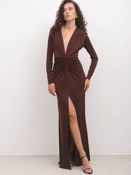 • Εντυπωσιακό άνοιγμα στη μέση και μπροστινό σκίσιμο που αποκαλύπτει διακριτικά το πόδι