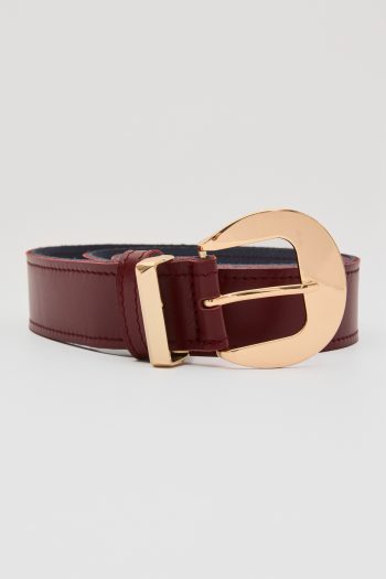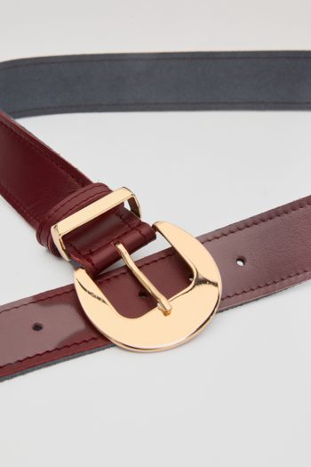 Η βουργουνδί ζώνη με τη γυαλιστερή χρυσή αγκράφα είναι ένα αξεσουάρ που χαρίζει κομψότητα και έντονο χαρακτήρα σε κάθε εμφάνιση. Το δερμάτινο λουρί σε βαθιά κόκκινη απόχρωση αναδεικνύεται μέσα από τη λάμψη της στρογγυλεμένης αγκράφας, δημιουργώντας μια πολυτελή και ταυτόχρονα δυναμική εικόνα. Ιδανική για να τονίσει τη μέση σε φορέματα, ψηλόμεσα παντελόνια ή σακάκια, αυτή η ζώνη αποτελεί το κομμάτι–κλειδί που ολοκληρώνει ένα εκλεπτυσμένο σύνολο.