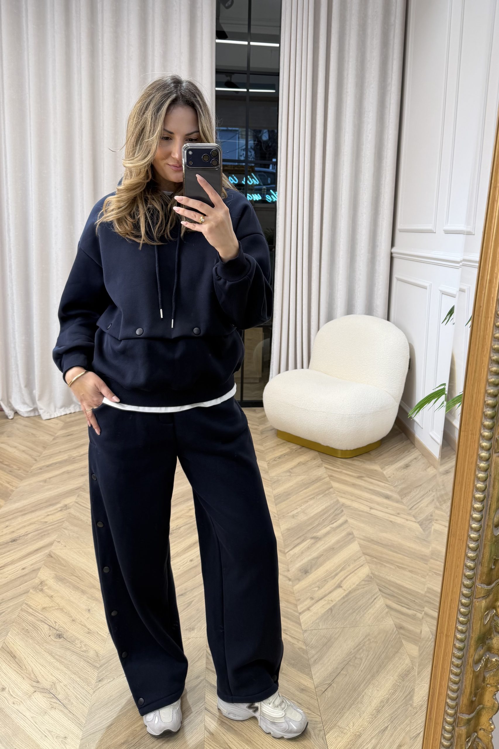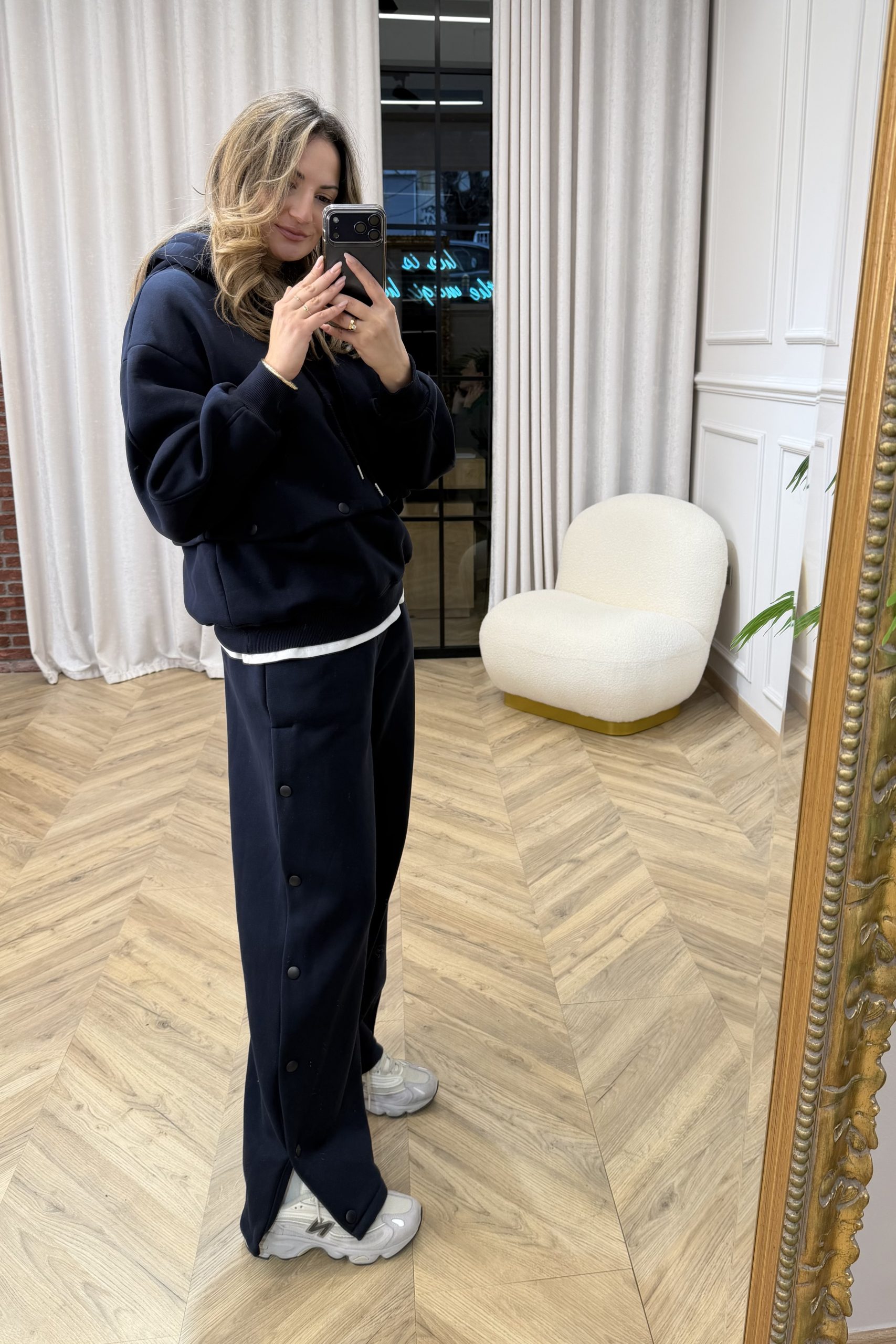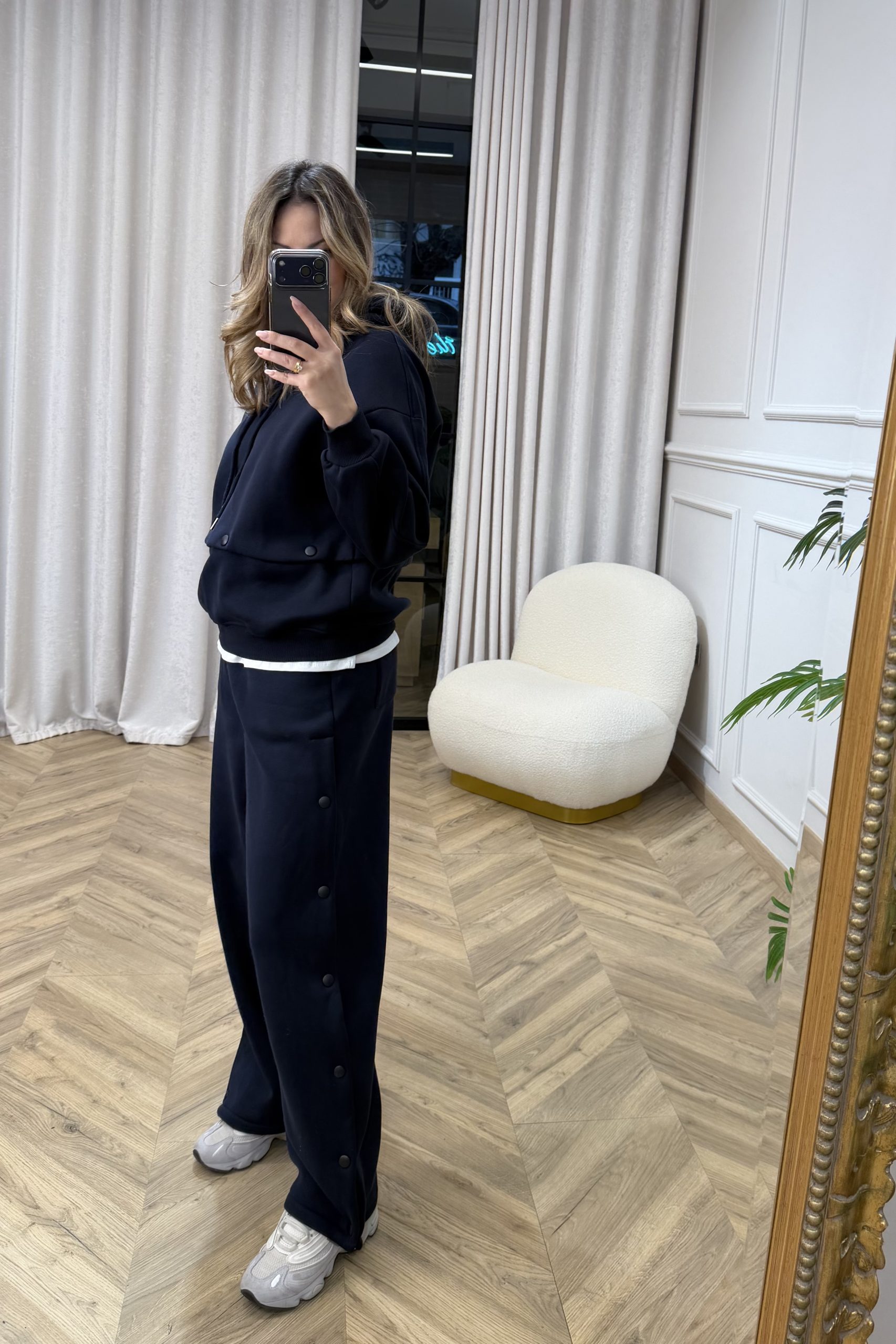 Ένα elevated athleisure σετ που συνδυάζει άνεση και σύγχρονη αισθητική. Το hoodie διαθέτει χαλαρή, άνετη γραμμή με ρυθμιζόμενη κουκούλα και διακριτικές λεπτομέρειες στο τελείωμα που δίνουν δομή και στιλ. Η εφαρμογή του είναι relaxed, ιδανική για layering, ενώ το καθαρό design το καθιστά διαχρονικό κομμάτι της γκαρνταρόμπας. Το παντελόνι σε φαρδιά, ίσια γραμμή προσφέρει κίνηση και άνεση, ενώ τα διακοσμητικά κουμπιά κατά μήκος στο πλάι προσθέτουν ένα fashion-forward twist στο κλασικό sporty ύφος. Η ελαστική μέση εξασφαλίζει τέλεια εφαρμογή και ευκολία στην καθημερινή χρήση. Ιδανικό για casual εμφανίσεις με sneakers, αλλά και για πιο προσεγμένα off-duty looks. Ένα σετ που ισορροπεί ανάμεσα στο minimal και το statement.