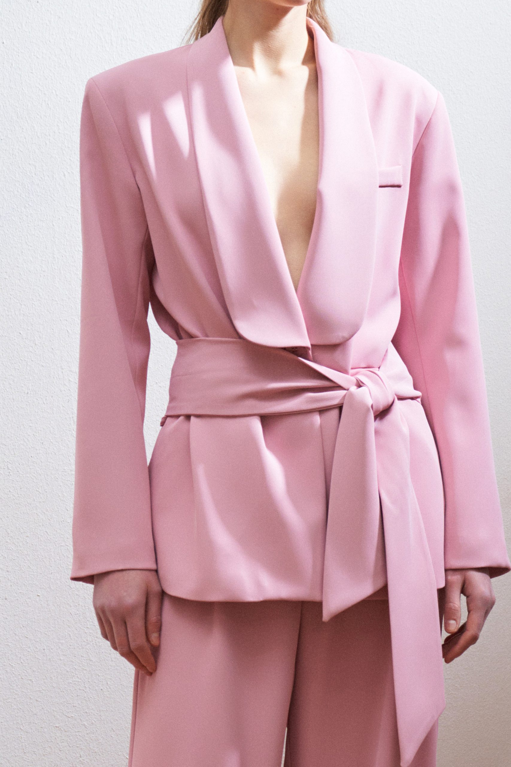 Ένα σύγχρονο κοστούμι με καθαρή editorial αισθητική, που επαναπροσδιορίζει το power tailoring μέσα από ρευστές γραμμές και σύγχρονη θηλυκότητα. Το blazer ξεχωρίζει για τη δομημένη κατασκευή του στους ώμους και τη βαθιά, ανοιχτή λαιμόκοψη, δημιουργώντας ένα statement αποτέλεσμα που ισορροπεί ανάμεσα στη δύναμη και την κομψότητα. Η ζώνη στη μέση λειτουργεί ως αρχιτεκτονικό στοιχείο, τονίζοντας τη σιλουέτα και προσδίδοντας κίνηση και δυναμισμό. Το παντελόνι, με άνετη, straight–wide γραμμή, συμπληρώνει ιδανικά το σύνολο, προσφέροντας αίσθηση ρευστότητας και σύγχρονης κομψότητας. Η εφαρμογή του επιτρέπει ελευθερία στην κίνηση, διατηρώντας ταυτόχρονα ένα αυστηρό, καλοδομημένο αποτέλεσμα. Ένα κοστούμι σχεδιασμένο για να φορεθεί ως statement look, από day-to-night εμφανίσεις έως πιο elevated occasions, αποτυπώνοντας μια σύγχρονη, fashion-forward εκδοχή του κλασικού tailoring.
