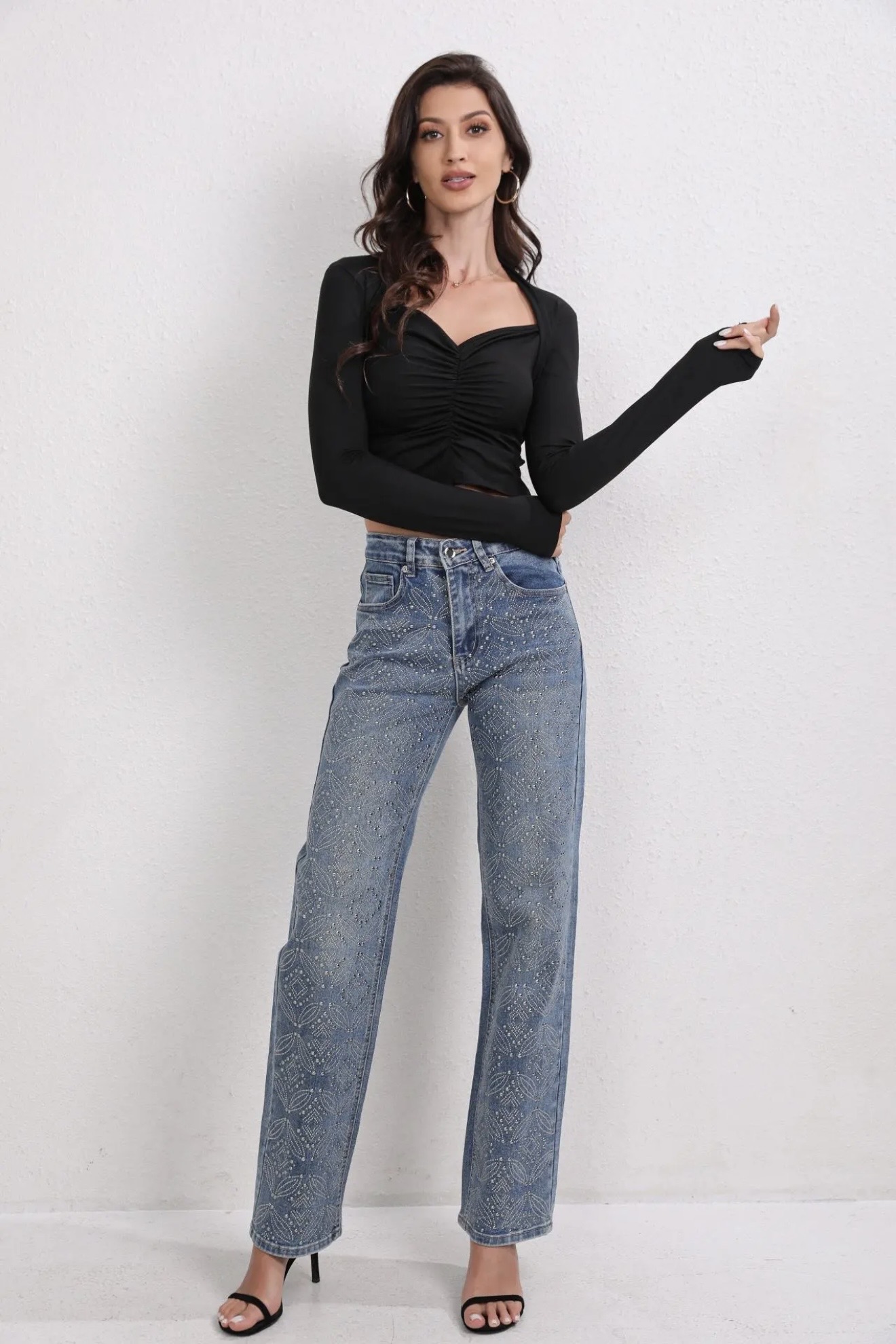 Ένα ιδιαίτερο παντελόνι με λαμπερές λεπτομέρειες. Η επιφάνειά του διακοσμείται με strass τοποθετημένα σε καλαίσθητο γεωμετρικό μοτίβο, δημιουργώντας μια διακριτική λάμψη που αναδεικνύει το σχέδιο χωρίς να βαραίνει το look. Η ψηλόμεση εφαρμογή και η ίσια γραμμή προσφέρουν κομψή και ισορροπημένη σιλουέτα, ενώ οι λαμπερές λεπτομέρειες προσθέτουν fashion χαρακτήρα και μια σύγχρονη, statement αισθητική. Ένα κομμάτι που συνδυάζει άνετα το casual στοιχείο με μια πιο εκλεπτυσμένη, εντυπωσιακή πινελιά.