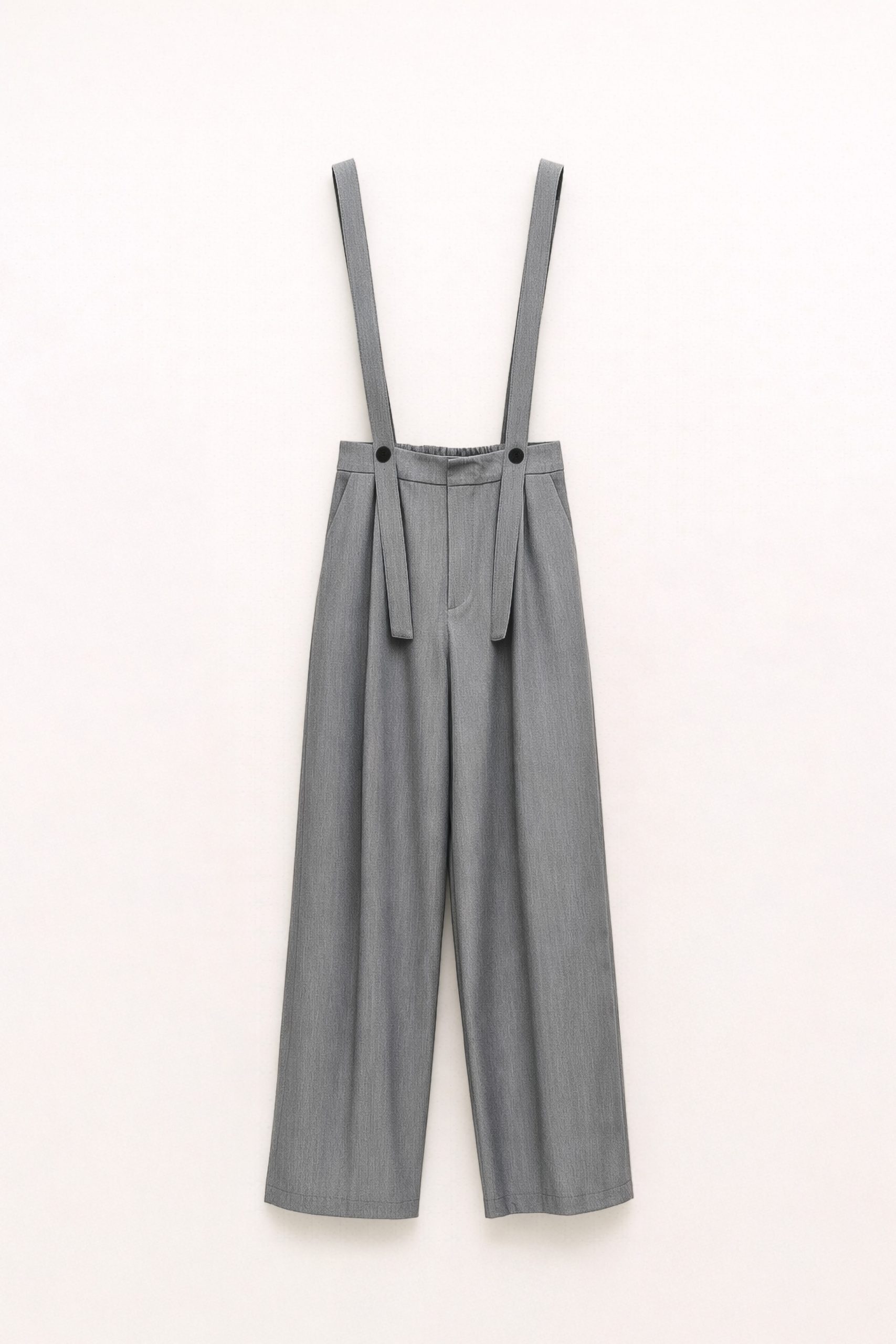 Ένα κομμάτι με αναφορές στο κλασικό ανδρόγυνο στυλ, προσαρμοσμένο σε σύγχρονη αισθητική. Οι τιράντες λειτουργούν ως σχεδιαστική λεπτομέρεια που προσθέτει χαρακτήρα, ενώ η άνετη γραμμή χαρίζει ελευθερία κινήσεων και κομψή αίσθηση. Ιδανικό για εμφανίσεις που συνδυάζουν αυστηρότητα και δημιουργικότητα.