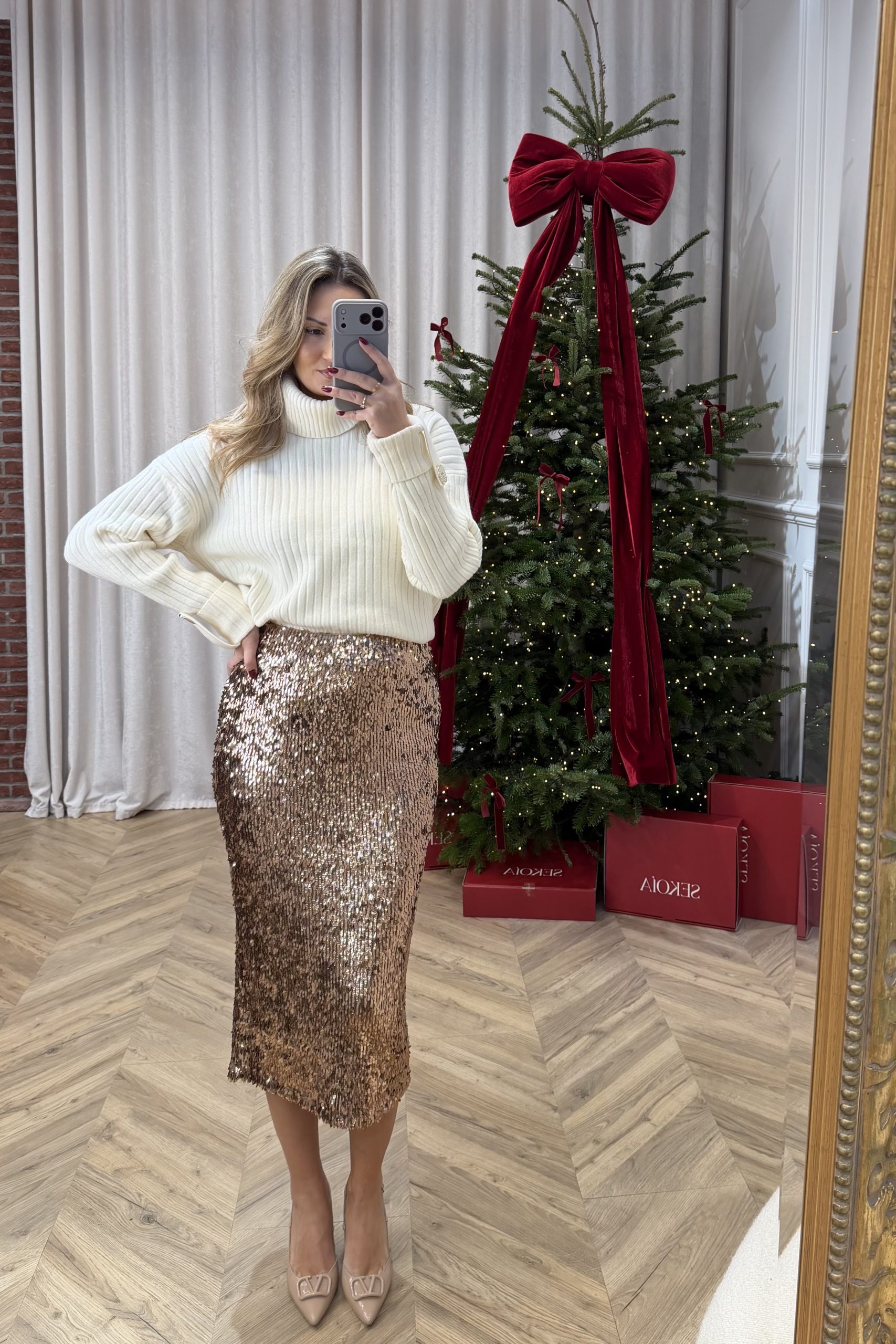 Μια φούστα που δεν απλώς «φοριέται» — εισβάλλει στο ντύσιμο με τη λάμψη και τον ρυθμό της. Το κρουστικό παιχνίδι φωτός πάνω στην επιφάνειά της δημιουργεί ένα εφέ συνεχούς κίνησης, σαν να ζωντανεύει κάθε φορά που κάνεις βήμα. Είναι το κομμάτι που φέρνει την ενέργεια ενός βραδινού editorial στο καθημερινό styling, χωρίς να χάνει την πειθαρχημένη κομψότητά του.Η γραμμή της αγκαλιάζει τη σιλουέτα με καθαρότητα και finesse, δίνοντας αβίαστα αυτό το “effortlessly polished” ύφος που ξεχωρίζει στις σελίδες των μεγάλων fashion magazines. Εντυπωσιακή, αλλά όχι κραυγαλέα· θηλυκή, αλλά με μια σύγχρονη δυναμική που την κάνει απόλυτα wearable. Είναι η φούστα που μεταμορφώνει κάθε look σε ιστορία—μια ιστορία γεμάτη λάμψη, αυτοπεποίθηση και fashion attitude.