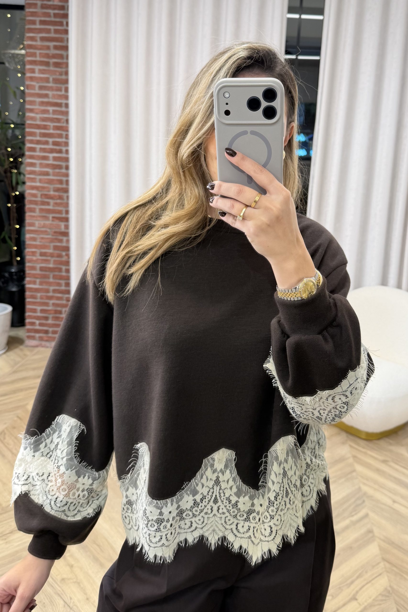 Ρομαντικό και σύγχρονο ταυτόχρονα, αυτό το καφέ φούτερ ξεχωρίζει χάρη στη λεπτεπίλεπτη εκρού δαντέλα που «ζωγραφίζει» το τελείωμά του. Ένας απαλός, ζεστός τόνος που συναντά τη λεπτότητα της δαντέλας, προσφέροντας ένα look που αποπνέει ανεπιτήδευτη φινέτσα.