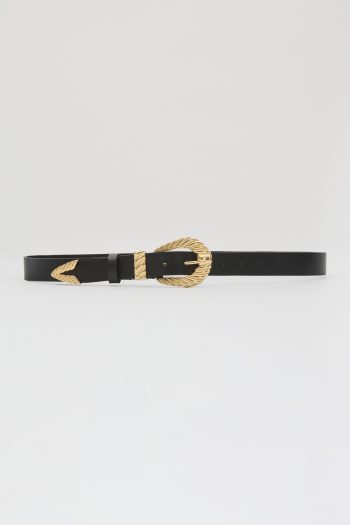 Η μαύρη ζώνη με αγκράφα και άκρη σε χρυσό ανάγλυφο σχέδιο συνδυάζει την κλασική αισθητική με μία έντονα διακοσμητική πινελιά. Η twisted υφή του μετάλλου δίνει μια πολυτελή διάσταση, μετατρέποντάς την σε αξεσουάρ που ολοκληρώνει το look με δυναμισμό και κομψότητα. Ιδανική για να τονίσει τη μέση σε φορέματα, παντελόνια ή ακόμα και σακάκια, προσφέροντας μια ξεχωριστή vintage-chic αίσθηση.