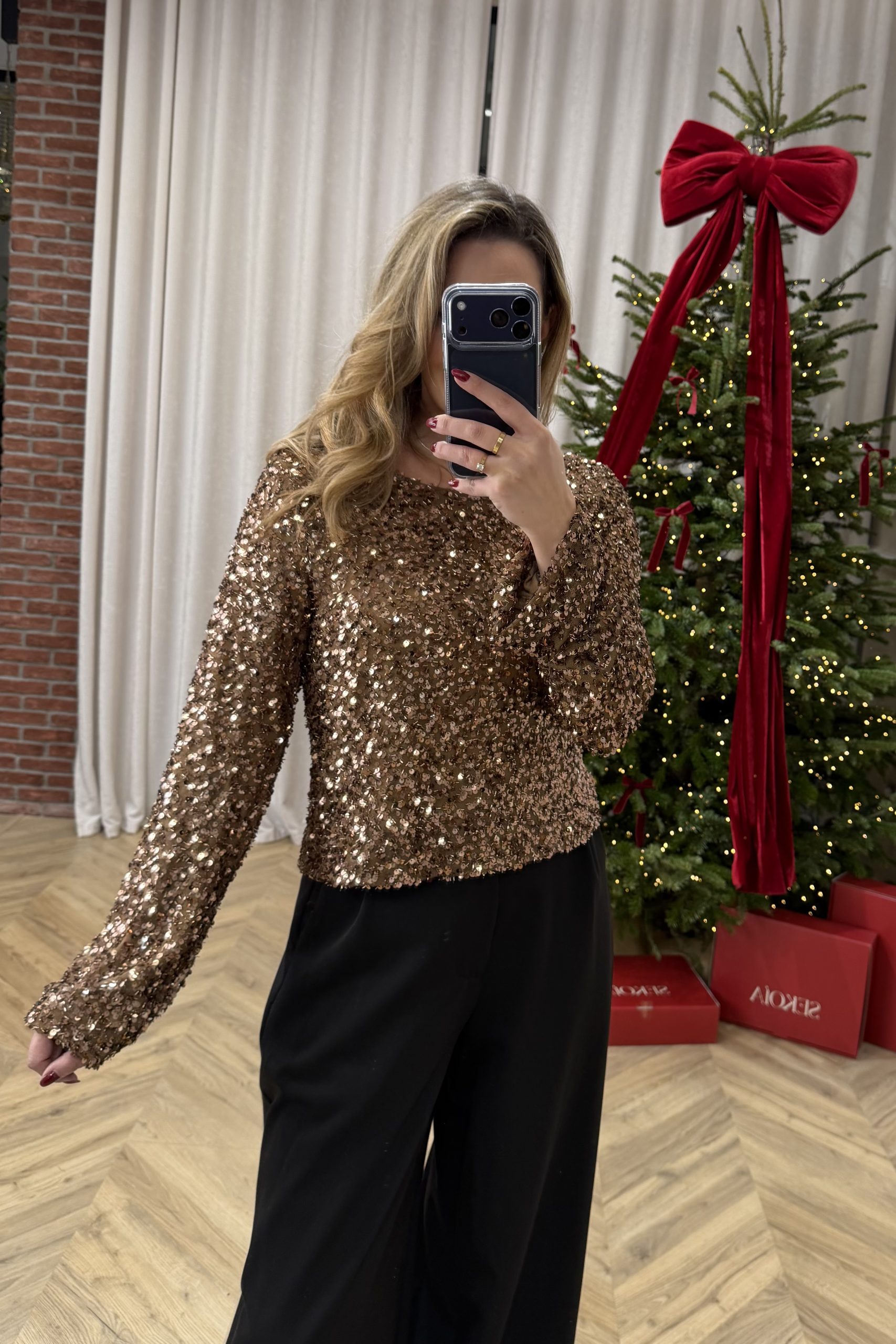Ένα statement κομμάτι που ισορροπεί ανάμεσα στη λάμψη και τη θηλυκή κομψότητα. Το top αγκαλιάζει τη σιλουέτα με καθαρή γραμμή, ενώ η πλούσια υφή του δημιουργεί ένα παιχνίδι φωτός που κινείται διακριτικά σε κάθε κίνηση. Τα μακριά μανίκια προσδίδουν αίσθηση επισημότητας, καθιστώντας το ιδανικό για βραδινές εμφανίσεις με fashion-forward χαρακτήρα. Η ανοιχτή πλάτη αποκαλύπτεται με τρόπο εκλεπτυσμένο, ολοκληρωμένη από ένα εντυπωσιακό φιόγκο που λειτουργεί ως κοσμηματική λεπτομέρεια και προσθέτει δραματικότητα χωρίς υπερβολή. Ένα κομμάτι που μετατρέπει το minimal styling σε απόλυτα editorial αποτέλεσμα, συνδυάζεται άψογα με tailored παντελόνια ή sleek φούστες και απευθύνεται σε εμφανίσεις που θέλουν να ξεχωρίζουν με αυτοπεποίθηση και διαχρονικό glam.